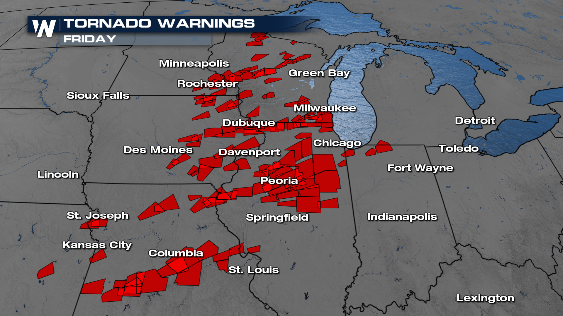 Tornadoes, hail, wind, and rain slammed the Midwest and Great Plains on Friday as a powerful storm system moved into the region. The same storm system was producing snow in Colorado while tornado warnings were being issued hundreds of miles to the east.