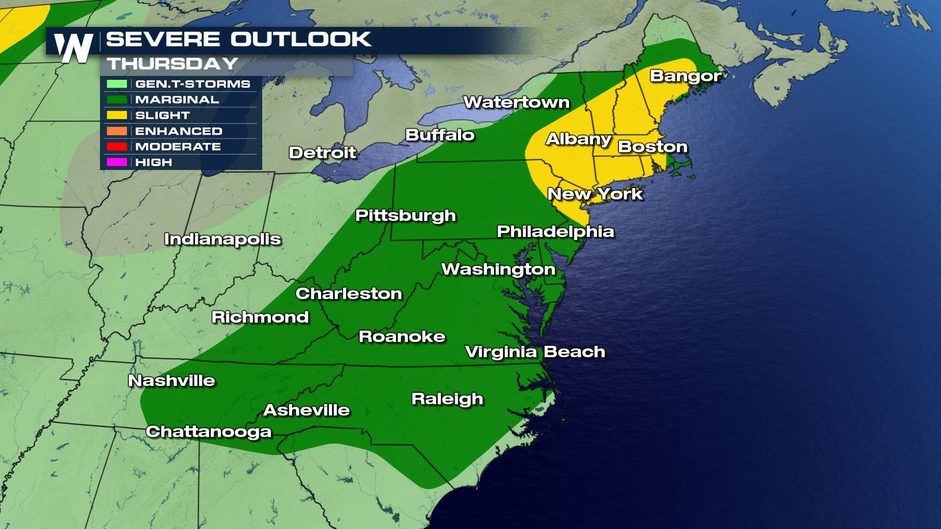 On Thursday, another weak trough will follow the previous day's energy across the Northeast and Mid-Atlantic, continuing the threat for severe thunderstorms, mainly in the afternoon when daytime heating leads to moderate instability.