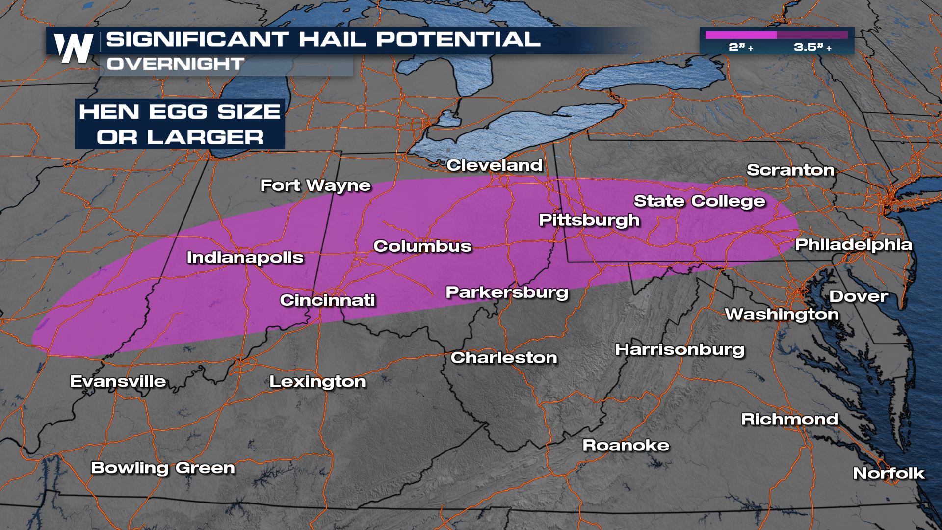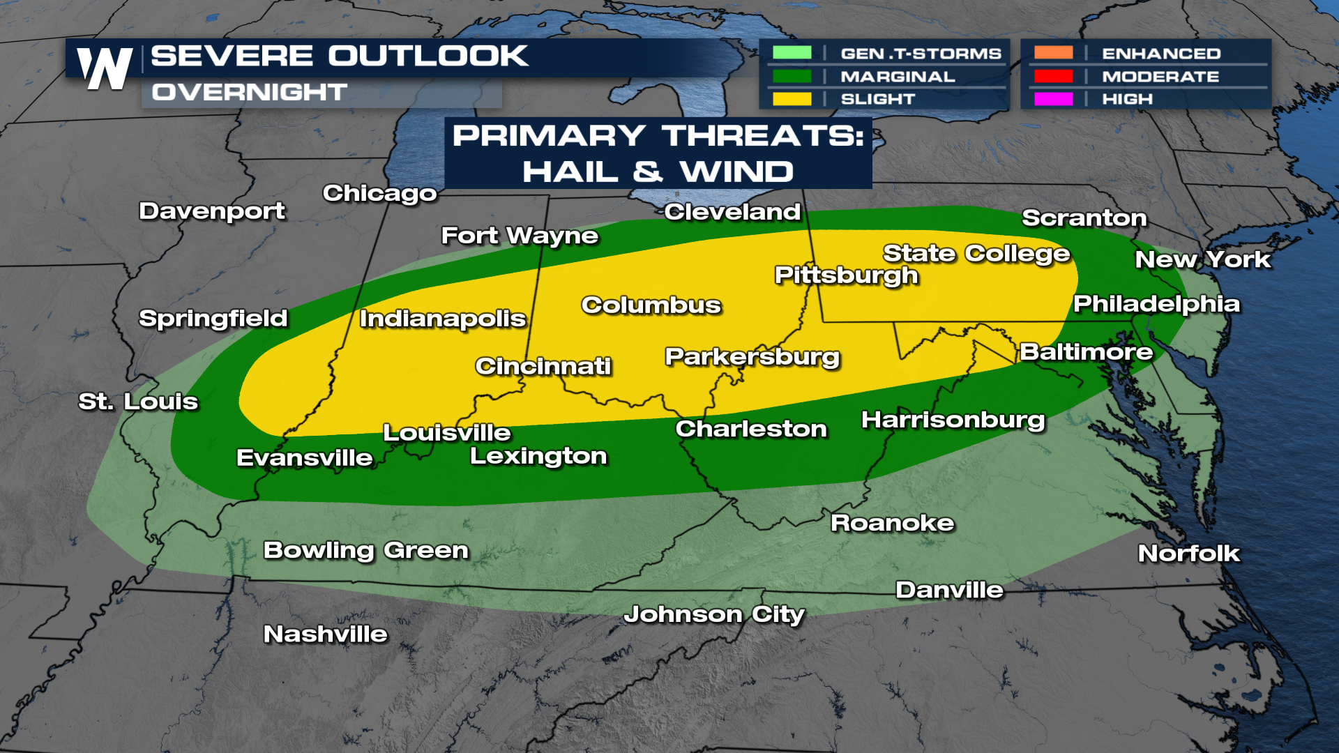 The Storm Prediction Center has highlighted parts of the Mid-Atlantic and Ohio Valley region with a SLIGHT Risk of severe storms through the overnight hours.