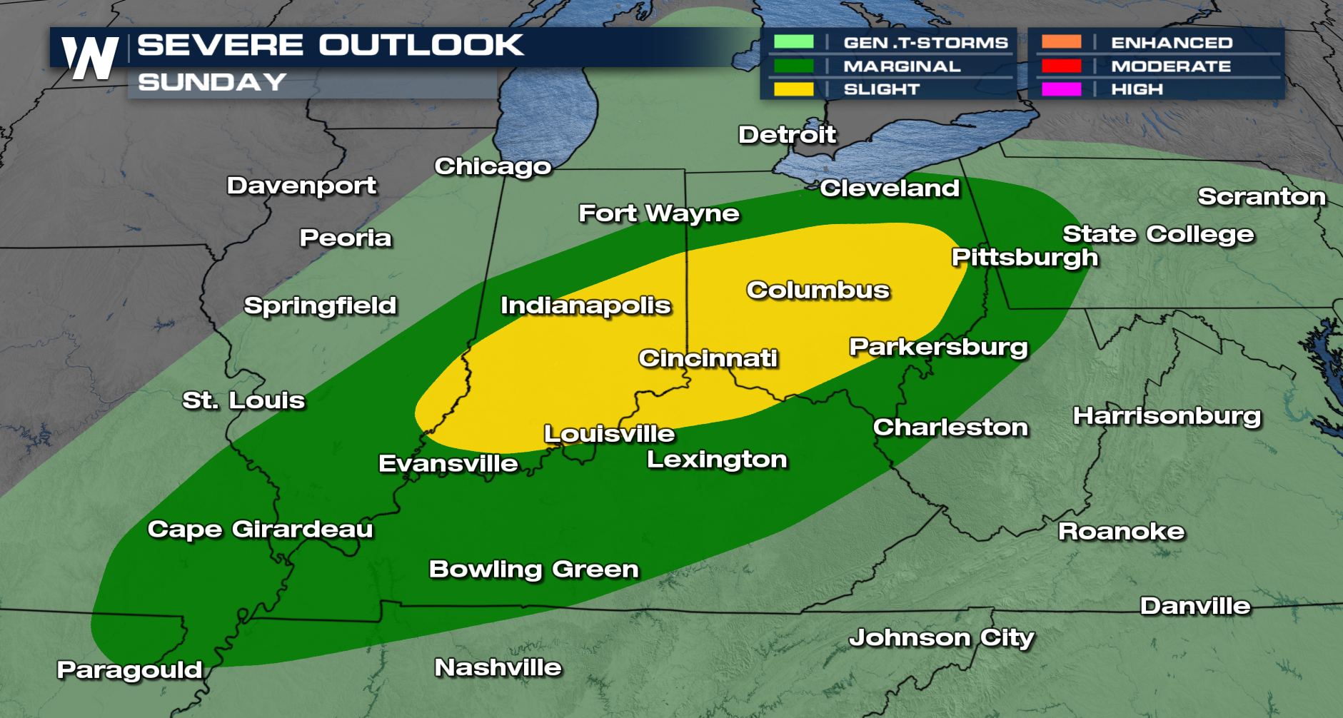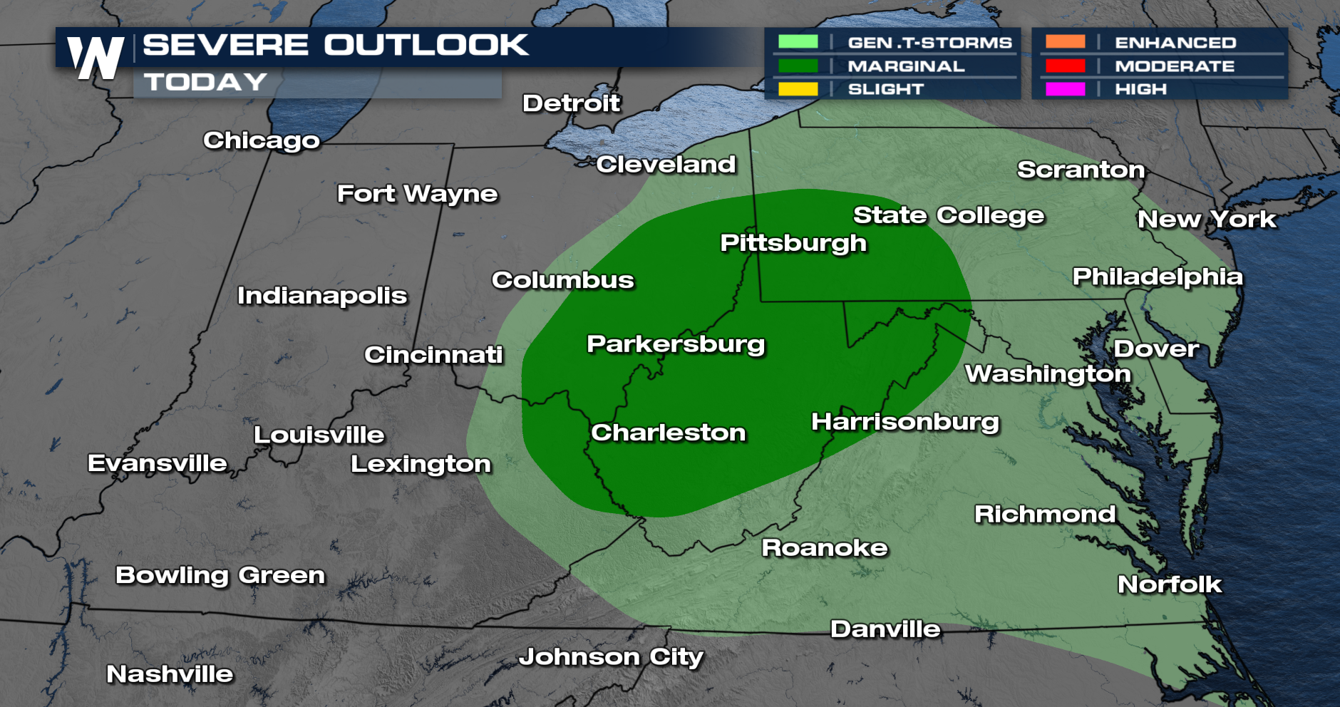 The Storm Prediction Center has issued a Marginal Risk (Level 1 out of 5) for severe weather today.