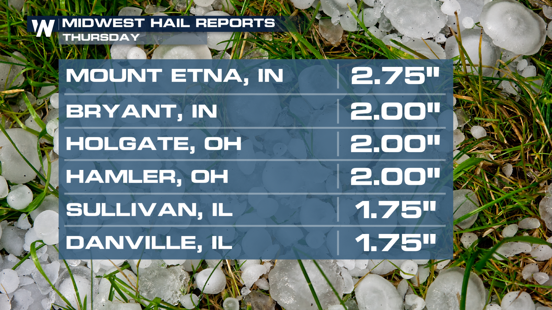 Hail topped the size of tennis balls in Mount Etna, Indiana, with quite a few more significant hail reports over the size of golf balls! Thankfully the hail was no where near the size of the record breaking 6"+ hail stone that fell about two weeks ago.