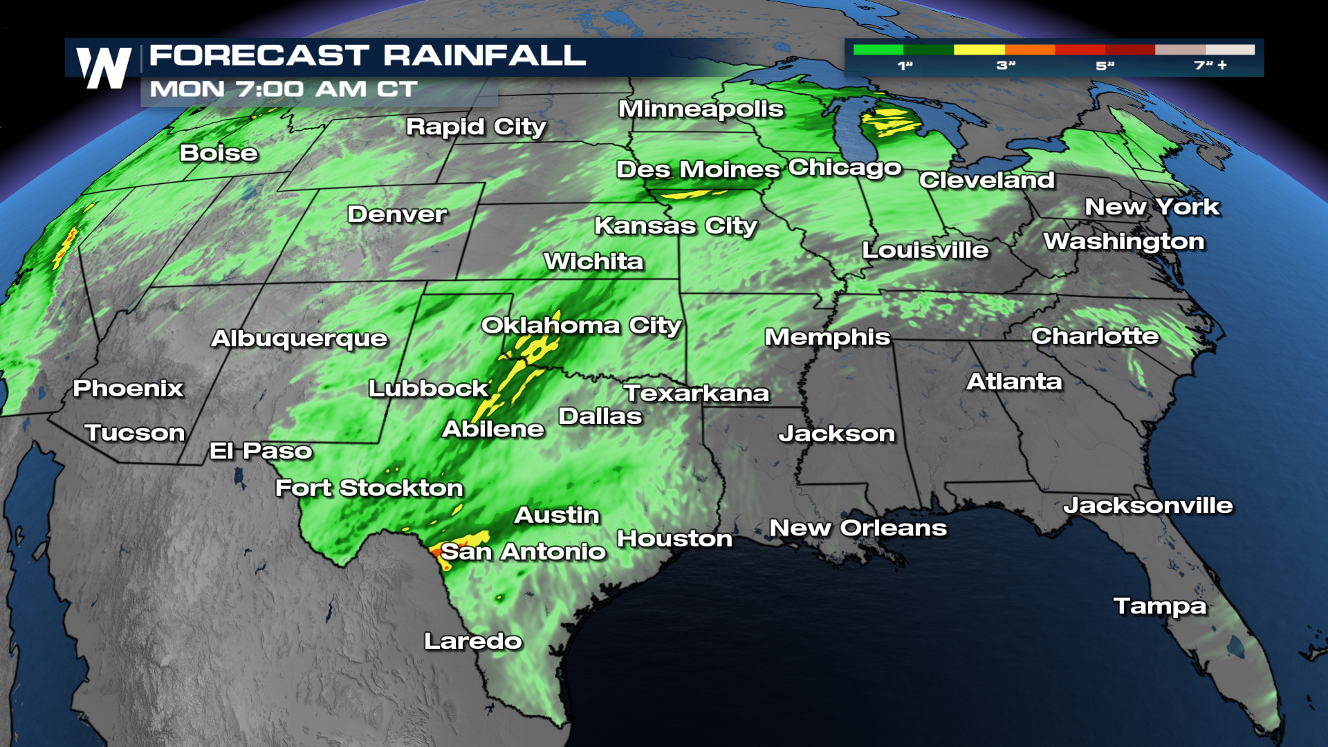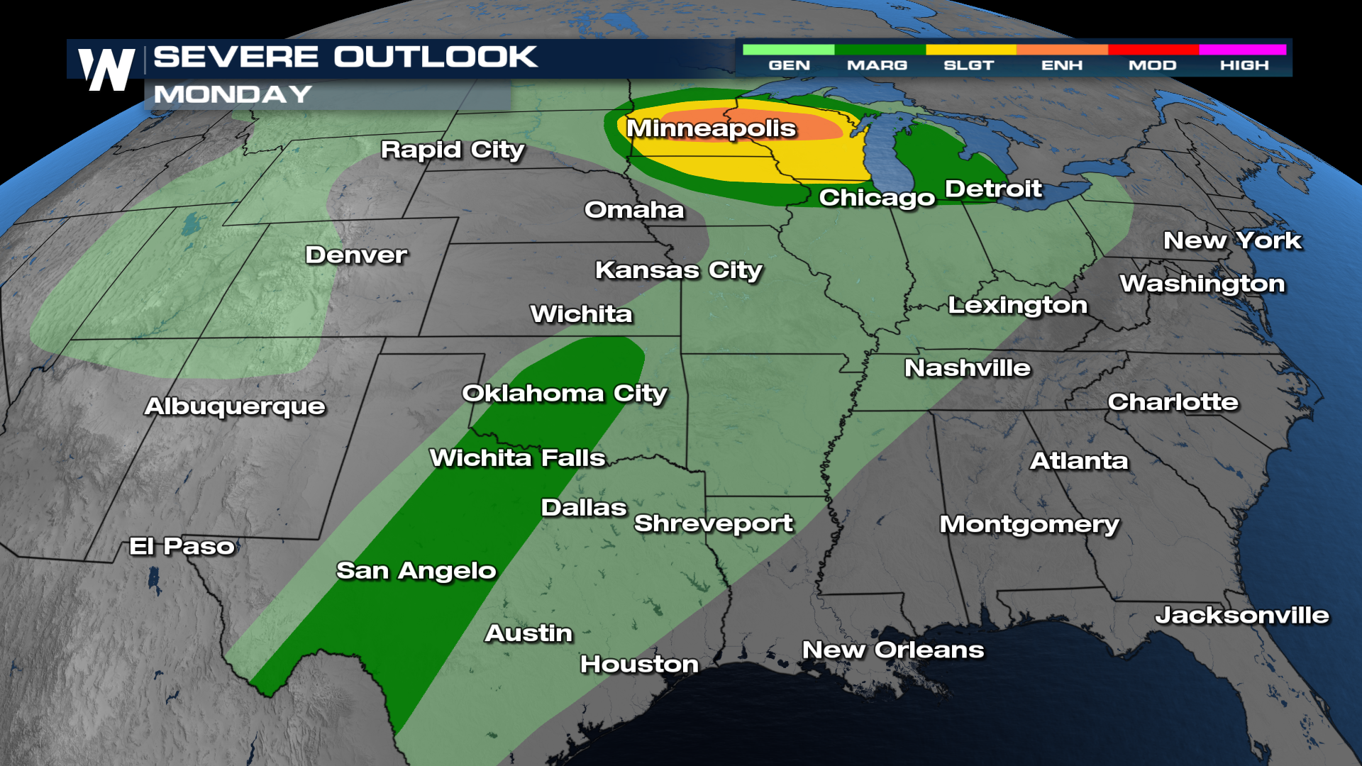 The SPC has maintained a SLIGHT risk for severe storms through Monday morning in Texas. This is a level 2 out of 5 risk for severe weather. In Minnesota, there is a MARGINAL risk for severe storms along the surface low.