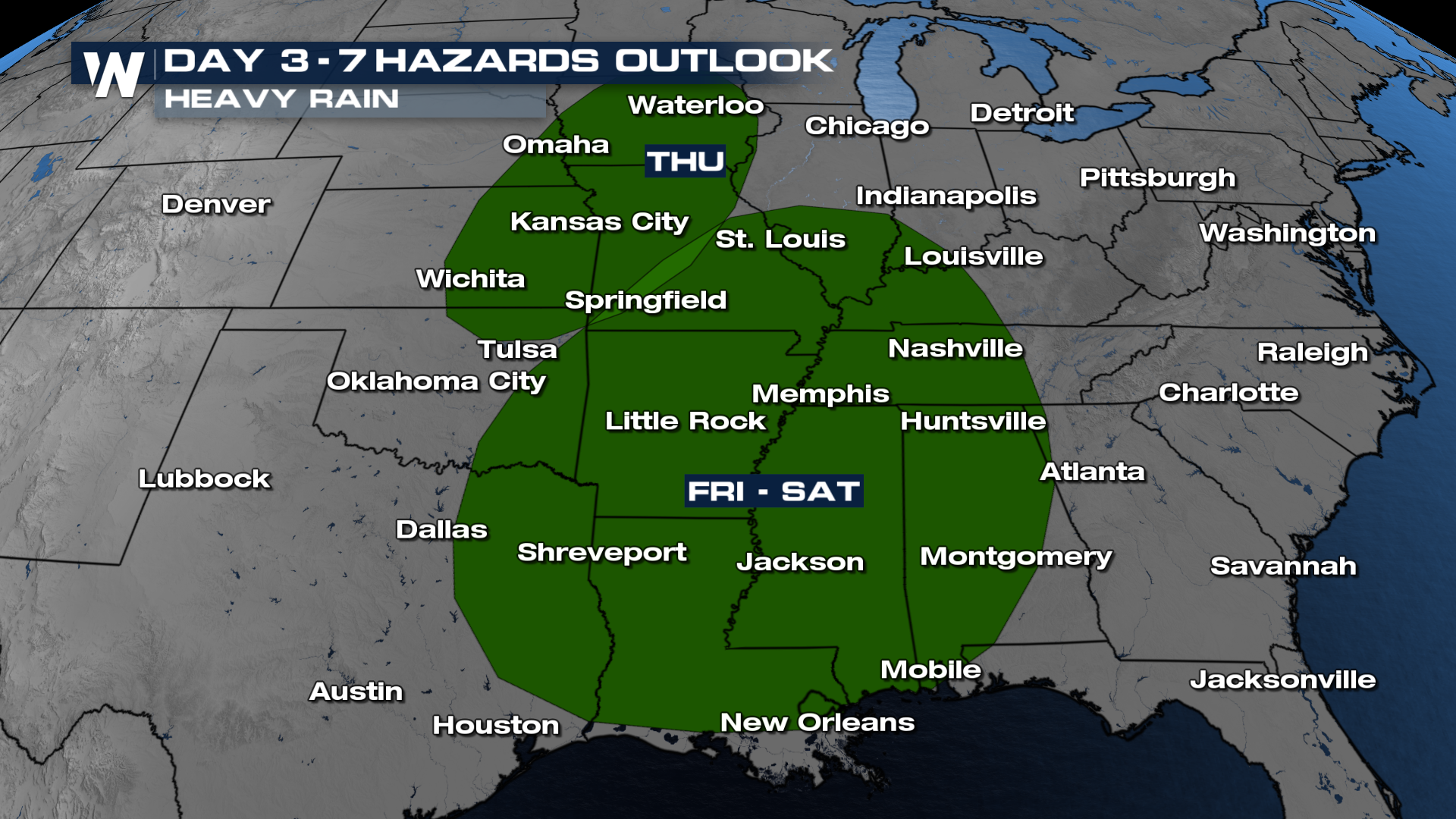 The WPC 3-7 Day Outlook has highlighted the threat of heavy rain from the Central Plains to the Gulf Coast from Thursday to Saturday, respectively.