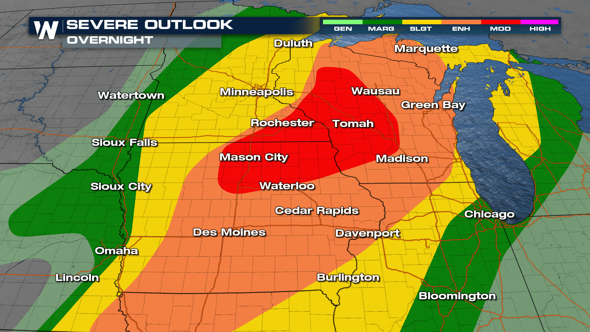 The Storm Prediction Center has issued a MODERATE (level 4 out of 5) risk for severe storms in portions of the Upper Midwest and Upper Mississippi Valley. Multiple corridors of severe thunderstorms remain possible.