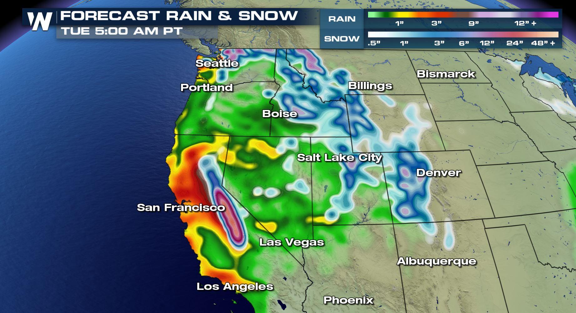 When you put the multiple storms together, several inches of liquid precipitation is in the forecast for the West. That will even translate to potentially multiple feet of snow for the highest elevations. With the next system coming in Monday and Tuesday, snow levels will be around 7,000 feet with highest snow potential above that elevation. All in all, here's what the precipitation forecast looks like into early Tuesday.
