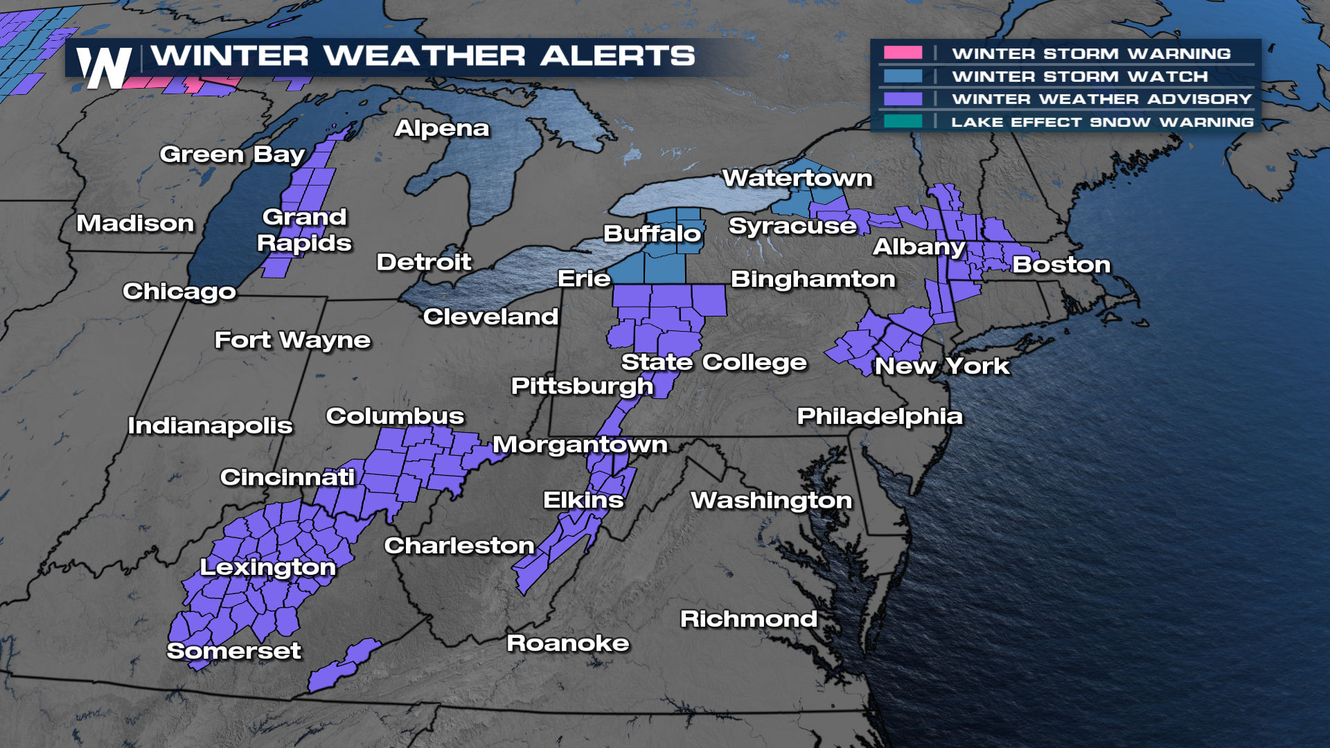 Lake-effect snow has been one of the biggest stories in the region. As cold air moves over the warm waters of the Great Lakes, bands of heavy snow are developing and repeatedly targeting communities downwind of the lakes. Parts of western and northern New York, northern Pennsylvania, and northern Michigan are seeing the greatest impacts, with snowfall totals piling up in localized areas. Some towns could measure accumulations in feet rather than inches, especially in teast and southeast of Lakes Erie and Ontario.