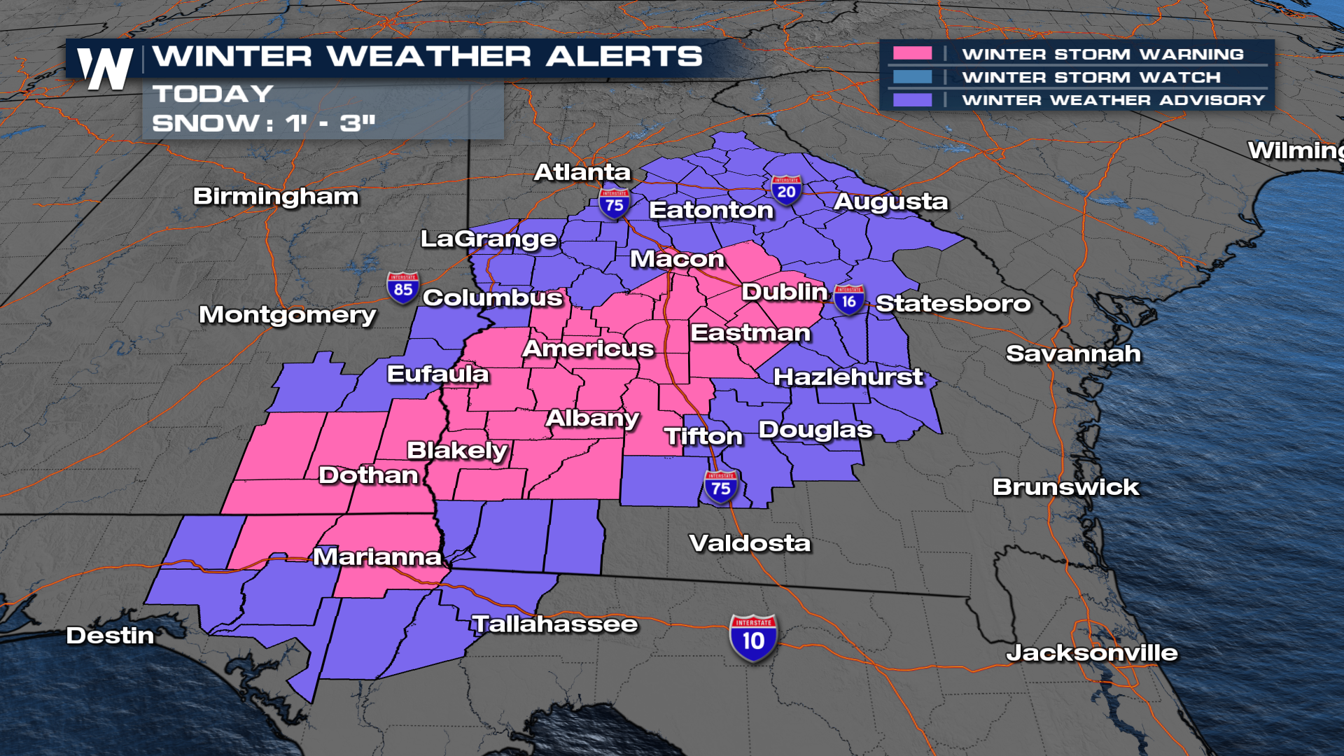 Winter Storm Warnings are up for parts of Central Georgia where as much as three to four inches of snow could fall. However, the snow will not stick around for long as temperatures warm above freezing into the afternoon hours.