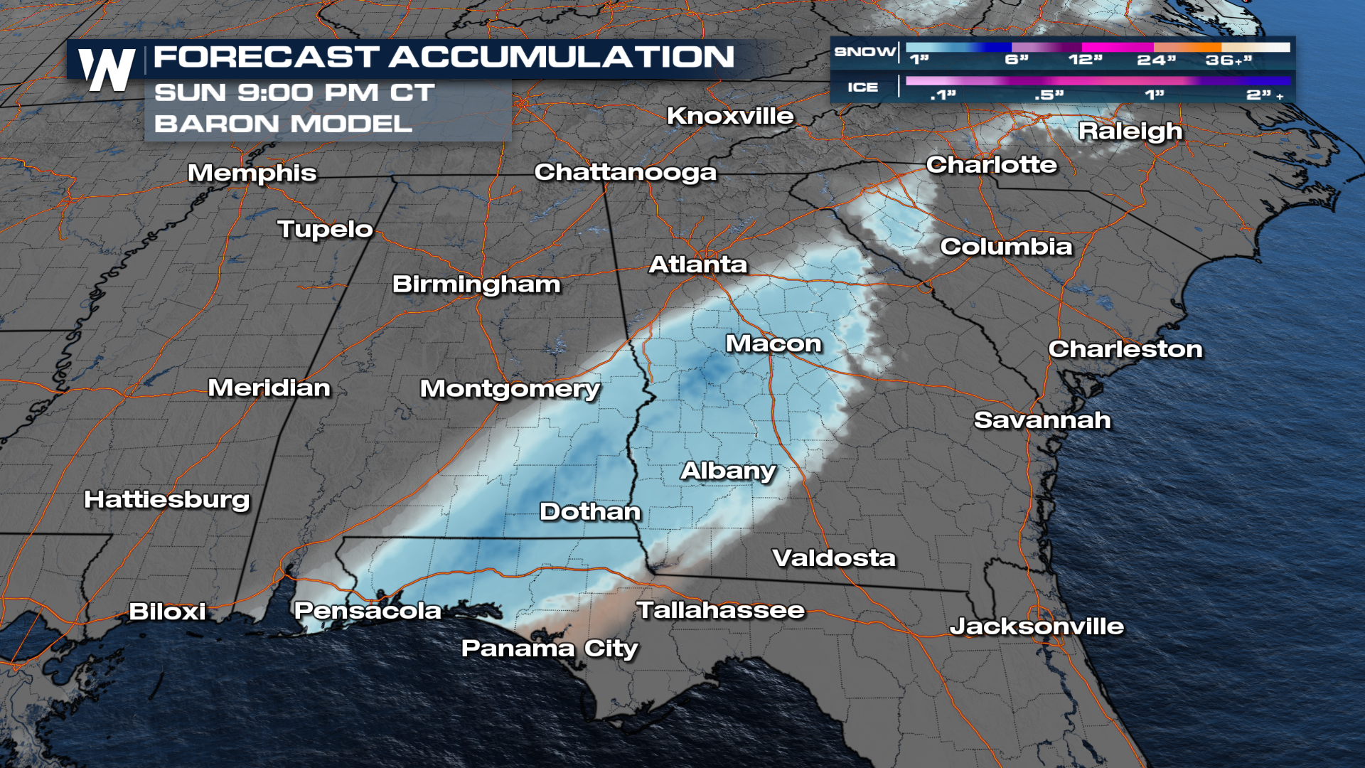 A winter weather advisory has been issued from eastern Alabama into southern Georgia, even a few into the northern Panhandle of Florida! Snow could accumulate in these areas, including interstates like I-75, I-16, and I-20.
