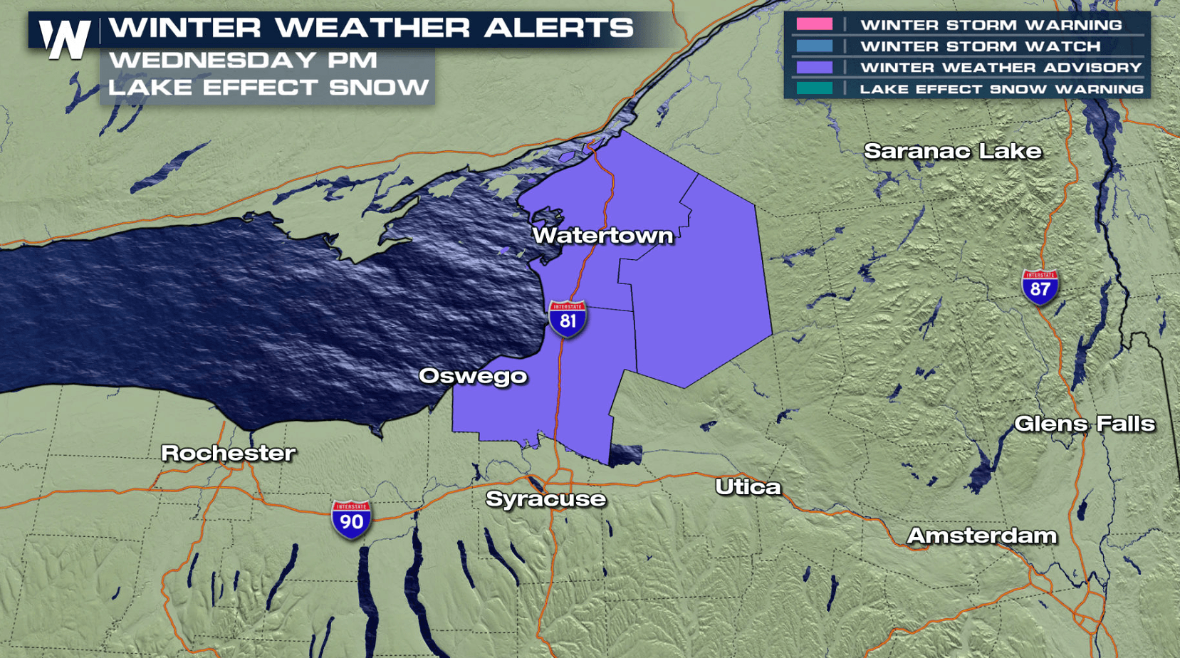 Lake enhanced snow showers will be falling along the eastern shores of Lake Ontario today (Wednesday), bringing several inches of accumulation. Winter weather advisories have been issued for up to 6" of snowfall. Totals will be lower around Lake Erie, with only a couple inches expected near Buffalo and Rochester, NY.