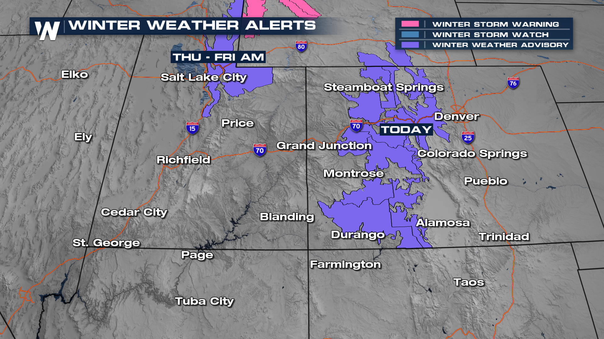 Winter alerts are in effect across the higher elevations of Utah and Colorado. Some areas are expecting a foot of snowfall, with isolated locations seeing higher totals. Winds will also be gusty across the higher terrain. Winter Weather Advisories were reissued across northern Utah for another round expected on Thursday.