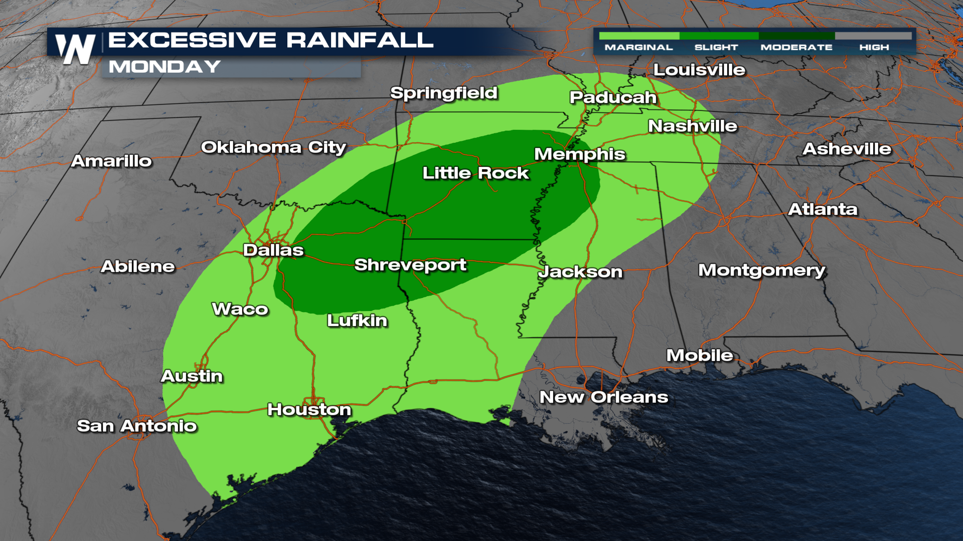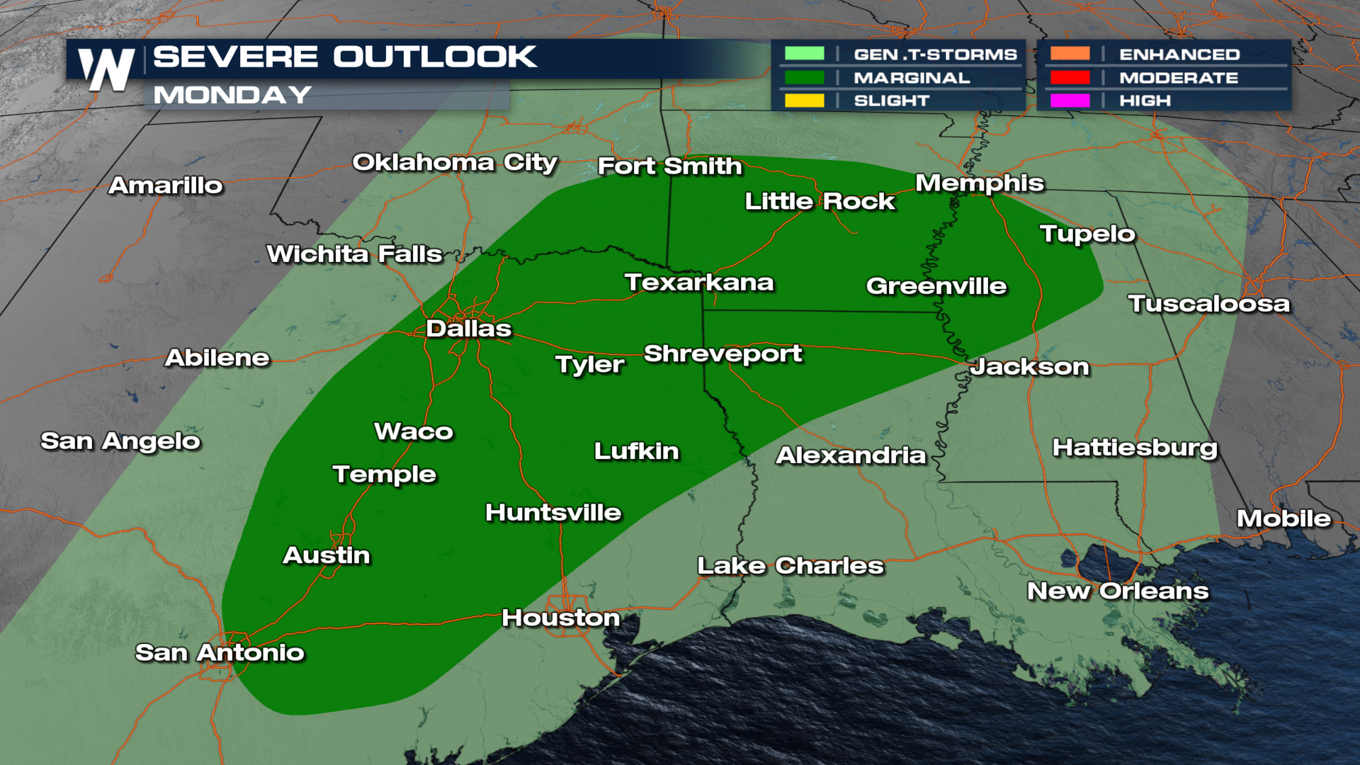 The severe weather threat continues to push east along the cold front on Monday. Areas from northern Mississippi to central Texas will see the chance for severe weather.