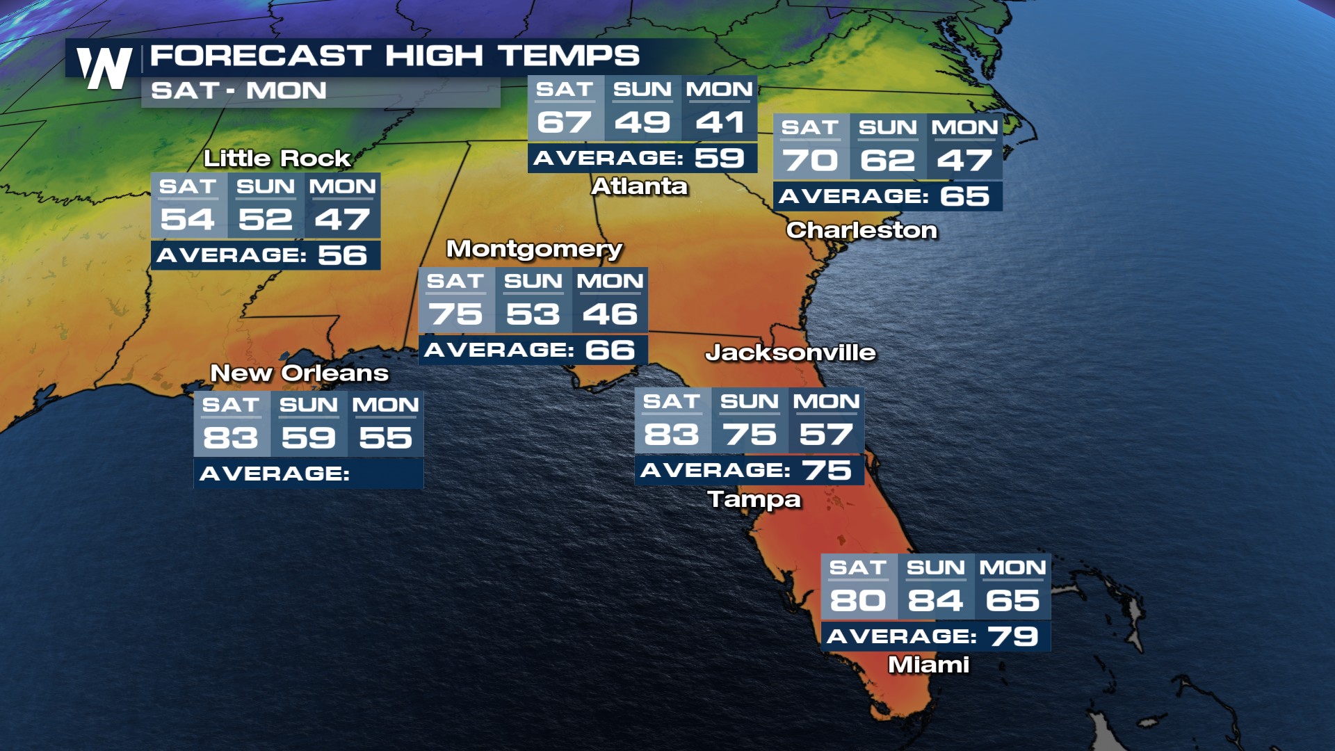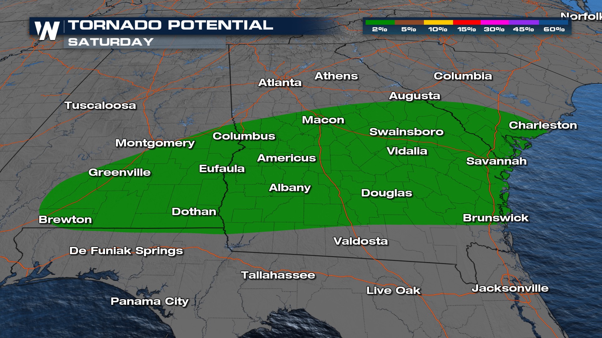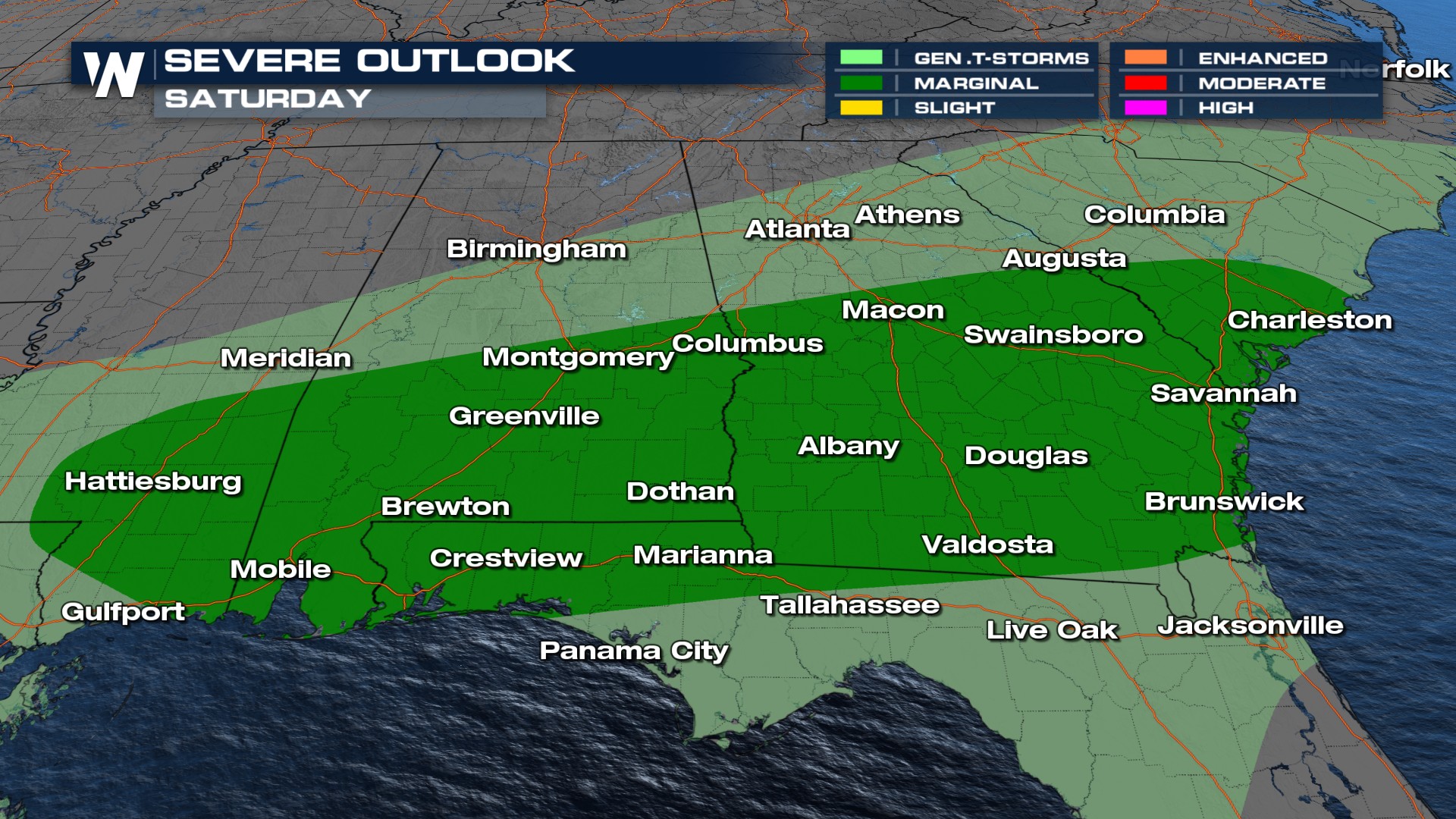 A developing storm system is expected to bring the potential for severe weather across portions of the Southeast Saturday, with the Storm Prediction Center outlining a Marginal Risk for strong to severe thunderstorms from eastern Mississippi through much of Alabama and into Georgia. The setup features a stalled frontal boundary draped across the region, acting as a focus for thunderstorm development.