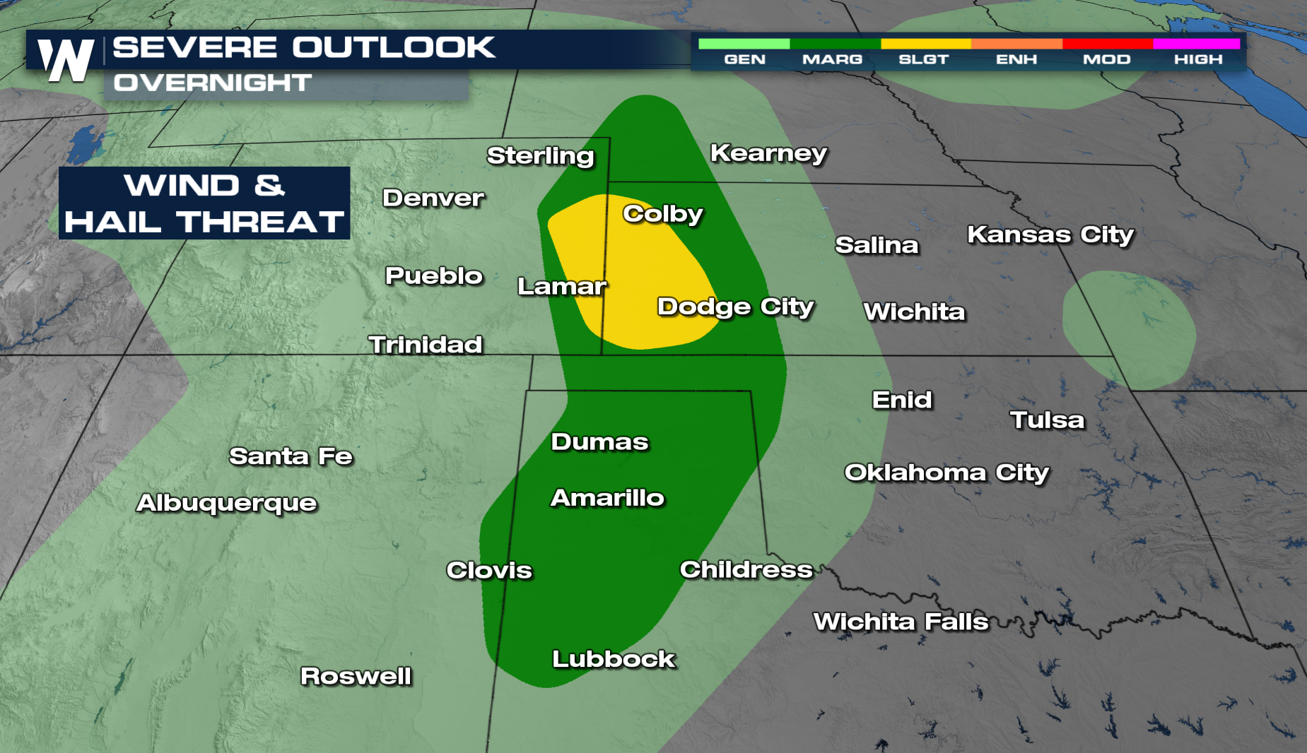 OVERNIGHT - The Storm Prediction Center has issued a Slight (level 2 out of 5) risk for severe storms overnight east of the Front Range and into the Plains. Damaging winds and large hail are the primary threats.