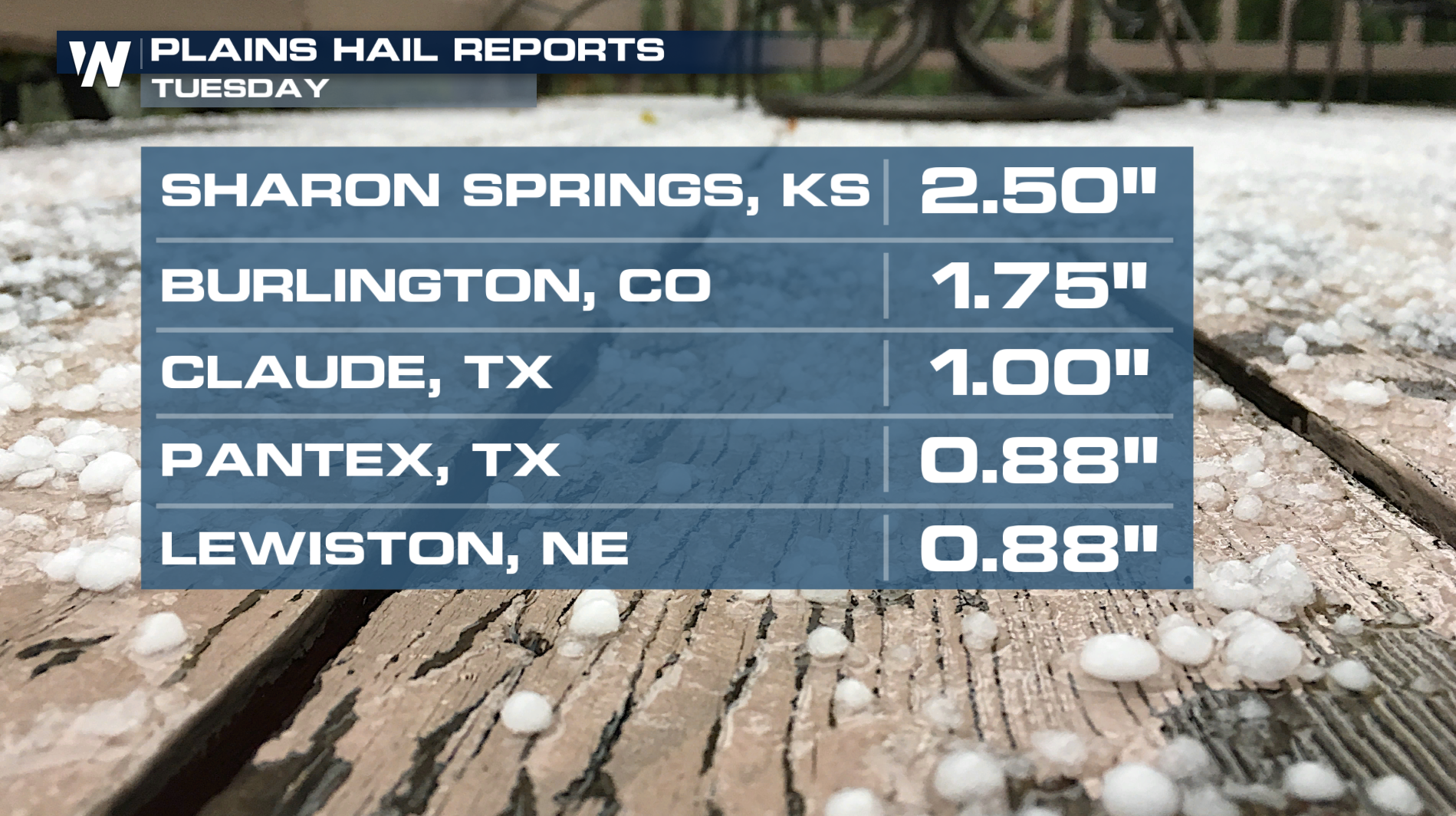 The southern plains has been hounded with storms over the last few days, with flooding being a major issue in central Kansas. Rainfall totals were 4"-10" on Monday into Tuesday. More storms worked through on Tuesday, with localized flooding, hail, and winds being the biggest concerns. Sharon Springs, Kansas saw hailstones of 2.50", this is larger than a golfball! The threat of a few strong severe storms will continue into the overnight hours.