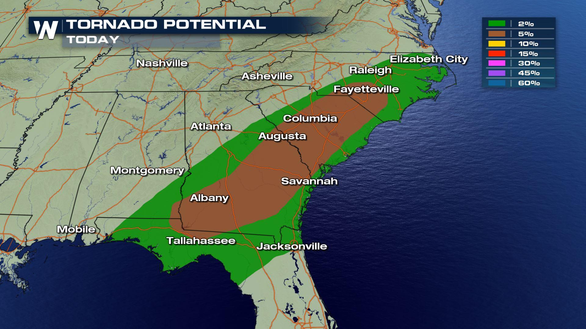 Scattered severe storms are likely today in areas like Georgia, South and North Carolina through the morning and afternoon. Cities like Savannah and Charleston could see some of the worst weather today.