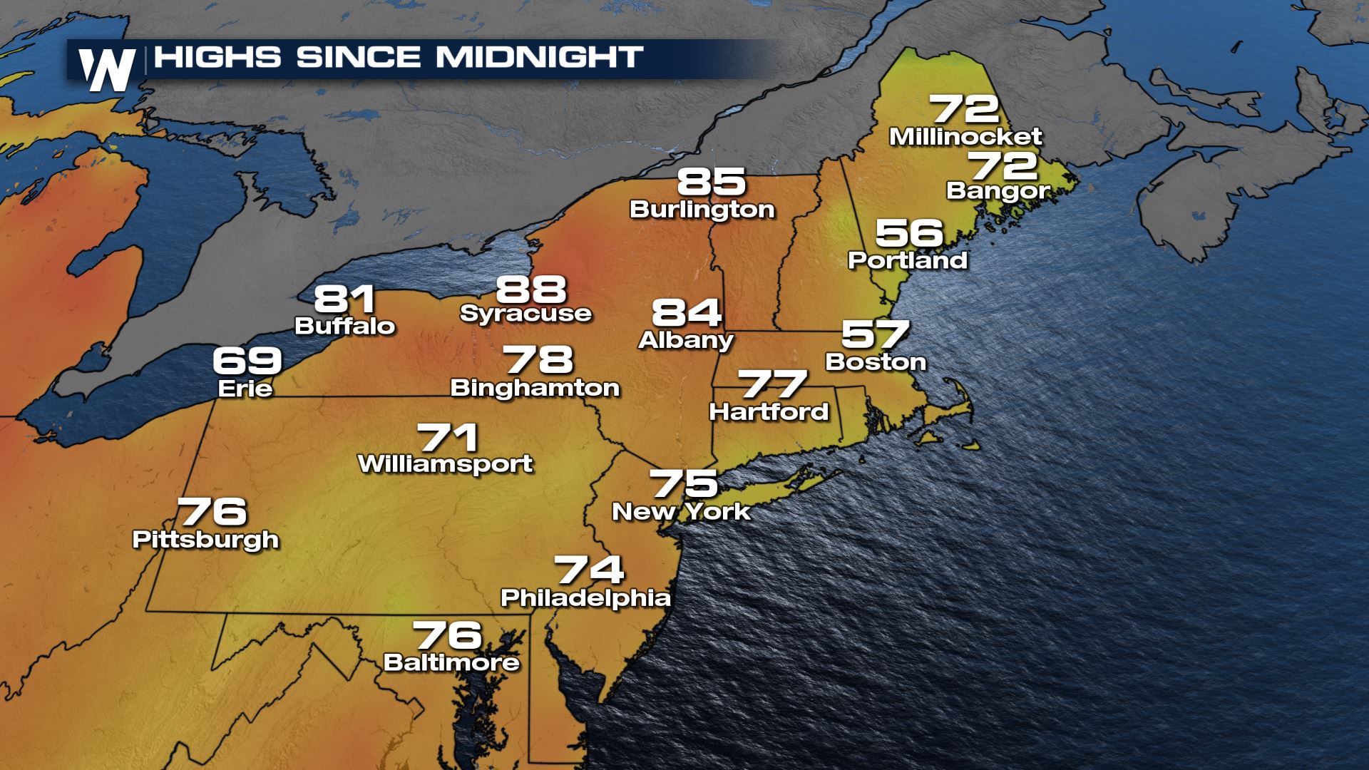 It was much cooler on Saturday than Friday in the Northeast, although some spots still warmed well into the 80s. Saturday's highs were still well above average for most of the region, just not nearly as warm as the record breaking heat earlier in the week.