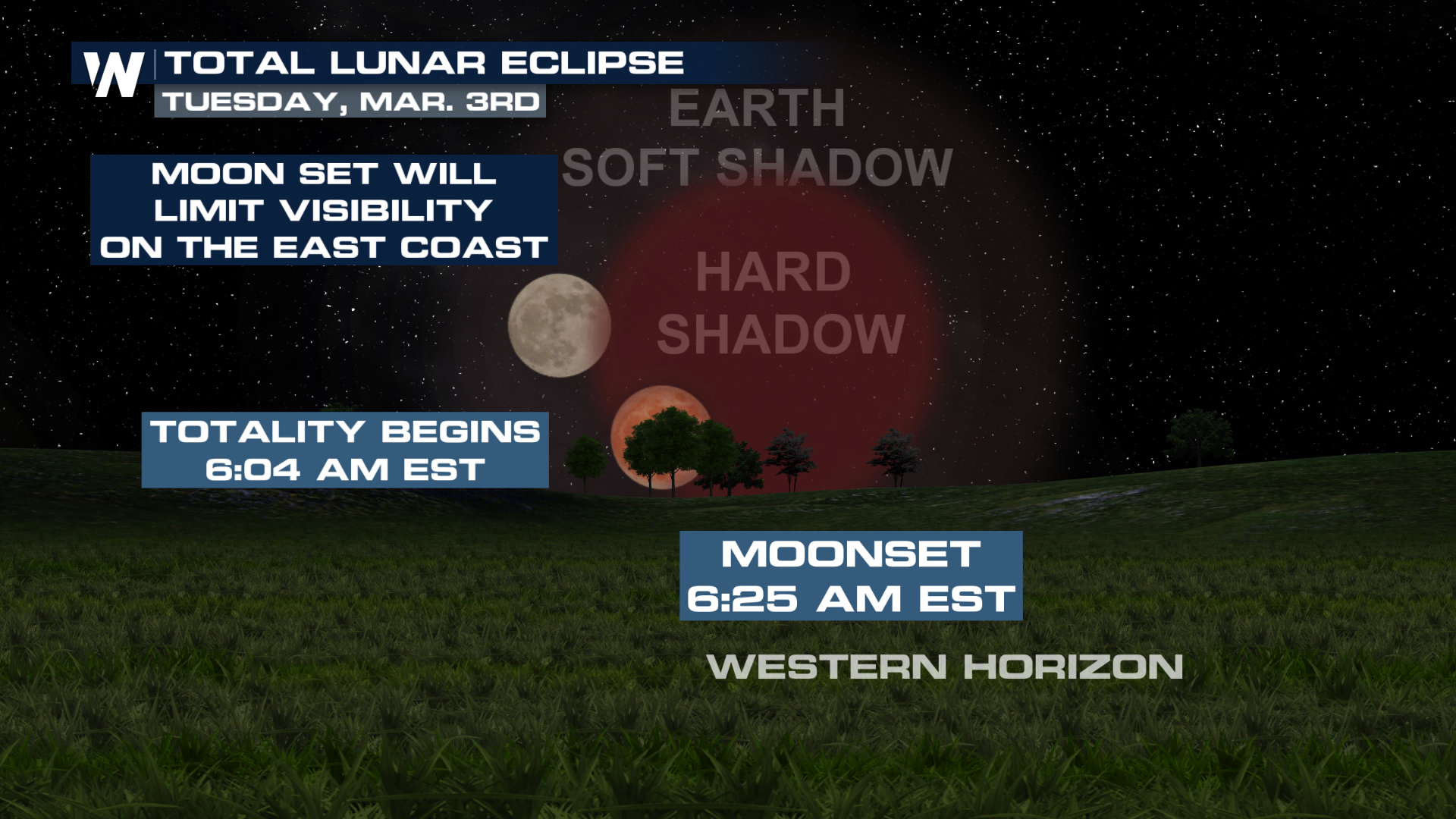 Unfortunately for folks on the east coast, the amount of time to see totality will be cut short, lasting only about 20-30 minutes (depending on your longitude) as the moon sets. Full eclipse times are in the image at the top of the page.