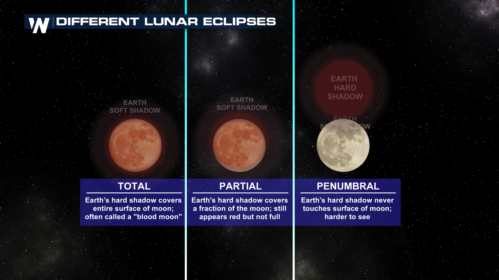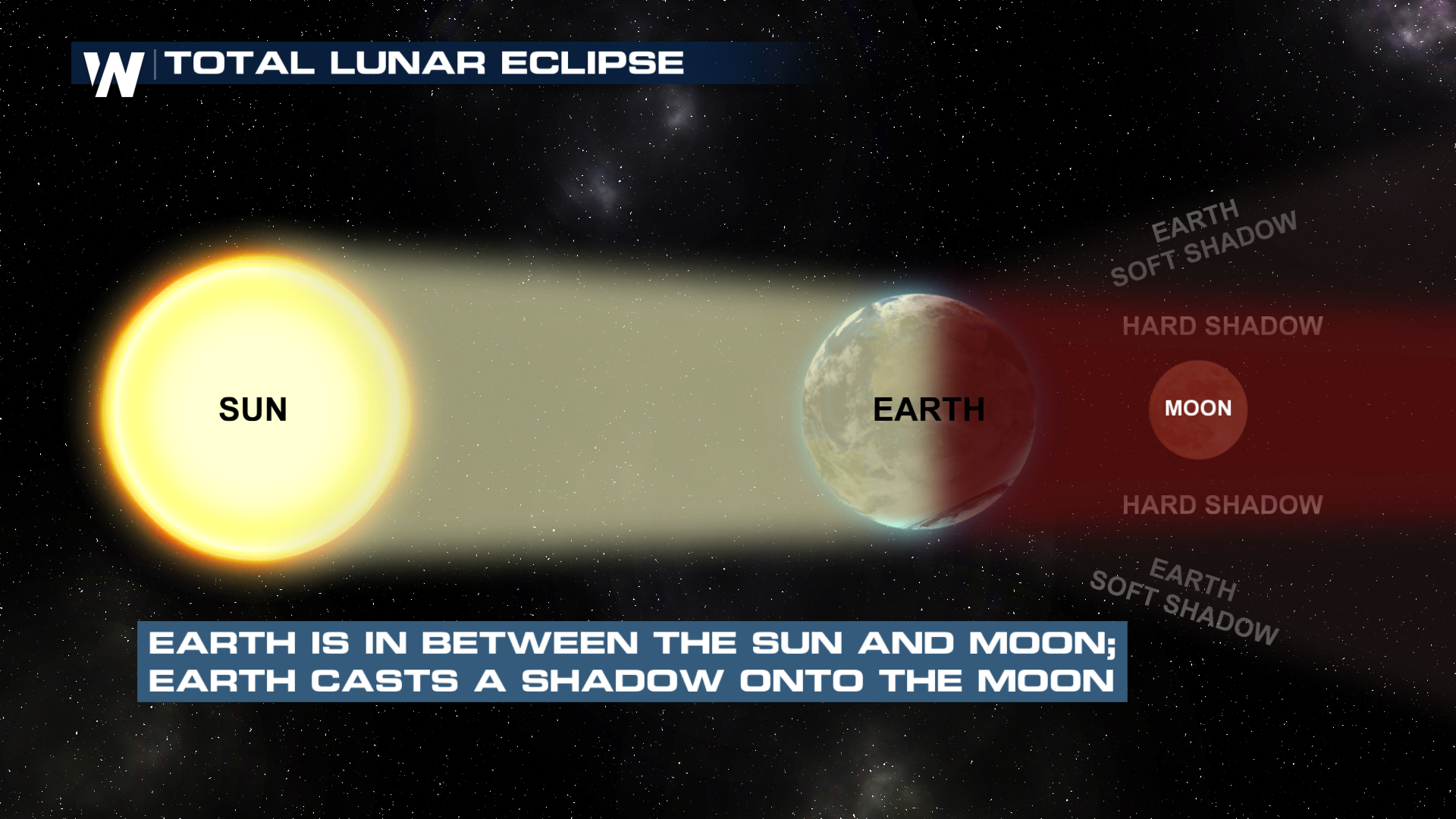 This eclipse is known as a "total" lunar eclipse, named for when the entirety of the Moon gets covered by Earth's hard shadow, known as the umbra. It's different from a solar eclipse in that the Earth is between the Moon and Sun, as opposed to a solar eclipse when the Moon is between the Earth and Sun.