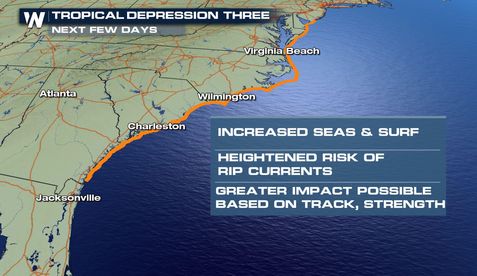 Tropical Depression Three is forecast to stay well off the coast of North Carolina in the Atlantic Ocean, but will still pose indirect impacts for parts of the East Coast. Dangerous and possibly life threatening rip currents are expected. Be sure to monitor conditions at your local beach if you plan to head into the water.