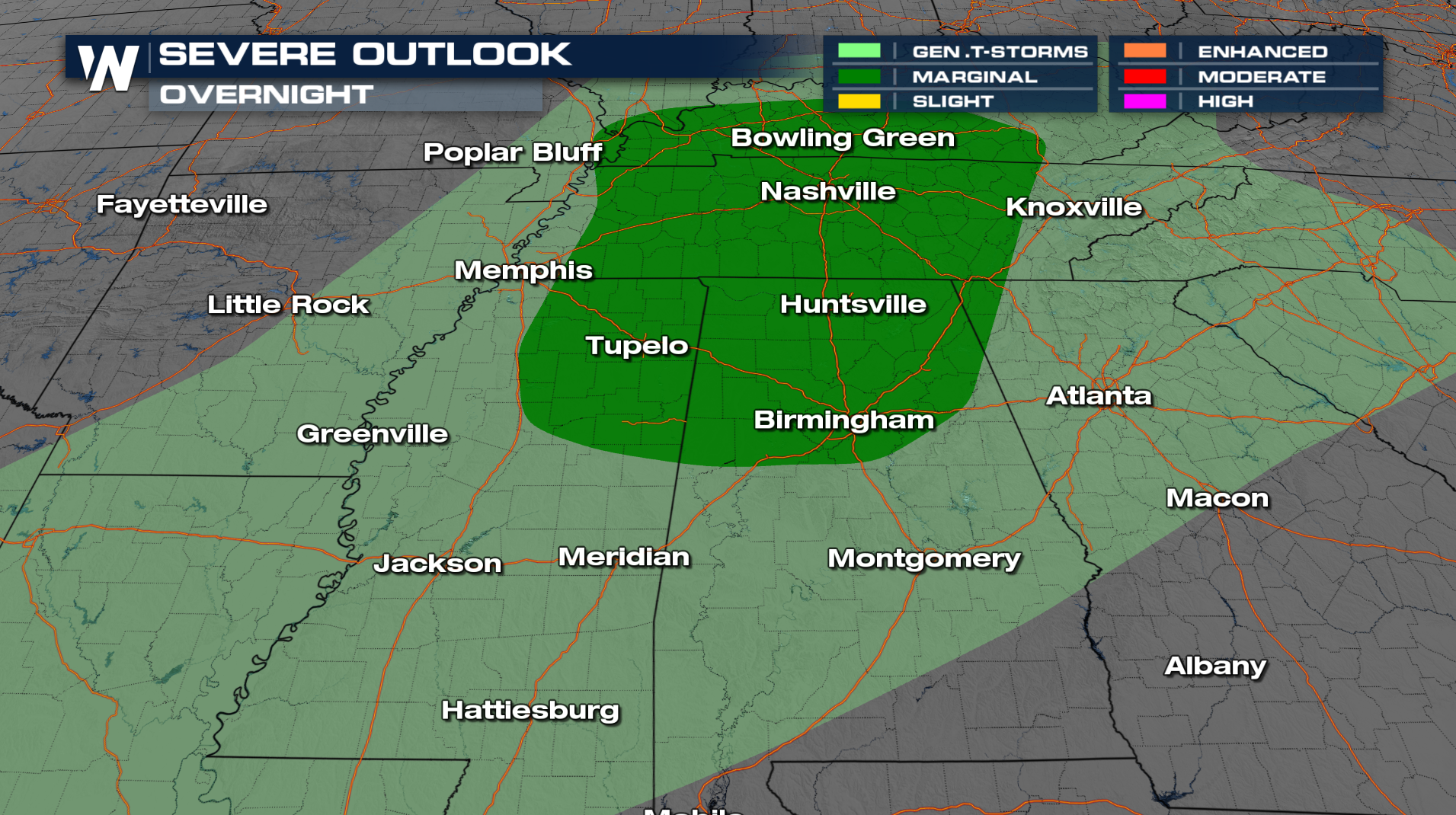 Severe storms are possible along the cold front tonight through Saturday morning from Kentucky into Mississippi. Wind damage is expected to be the primary hazard, so be sure to secure any loose objects outdoors.