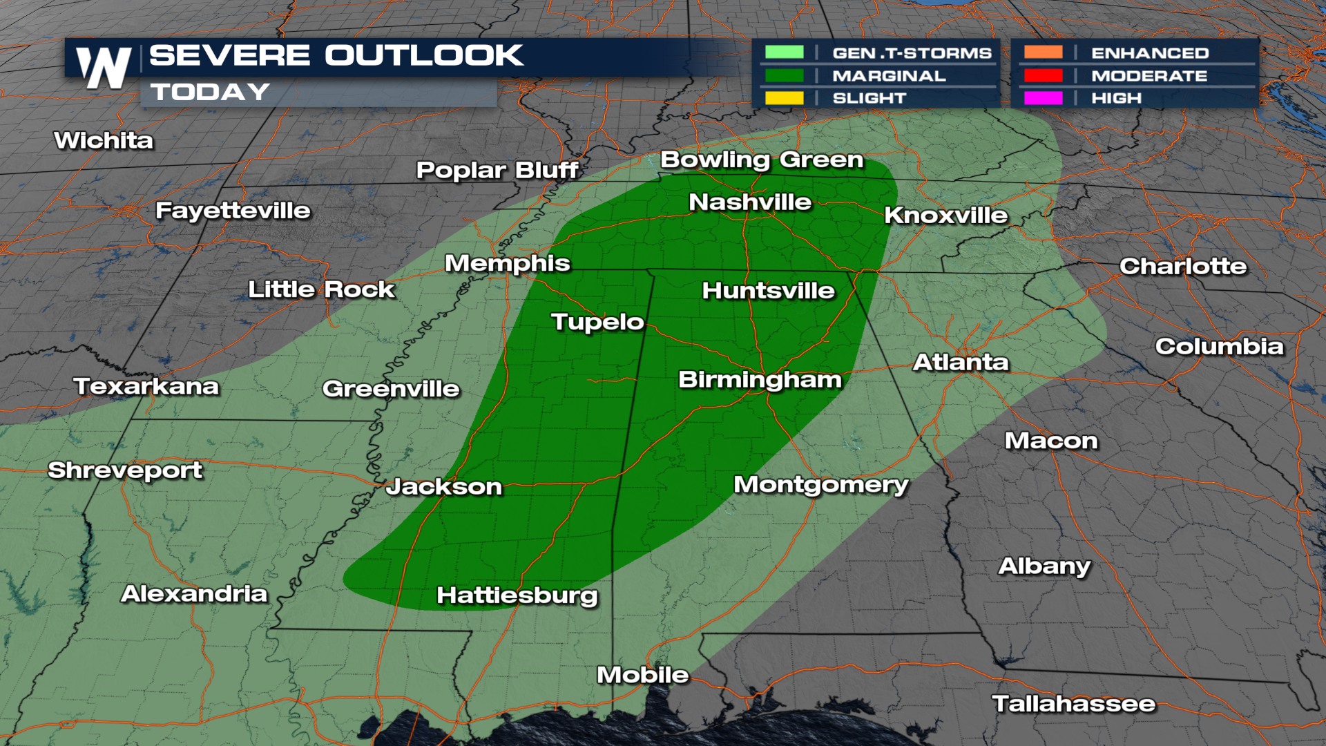 Severe storms are possible along the cold front from Friday afternoon through Saturday morning from Kentucky into Mississippi. Wind damage is expected to be the primary hazard, so be sure to secure any loose objects outdoors.