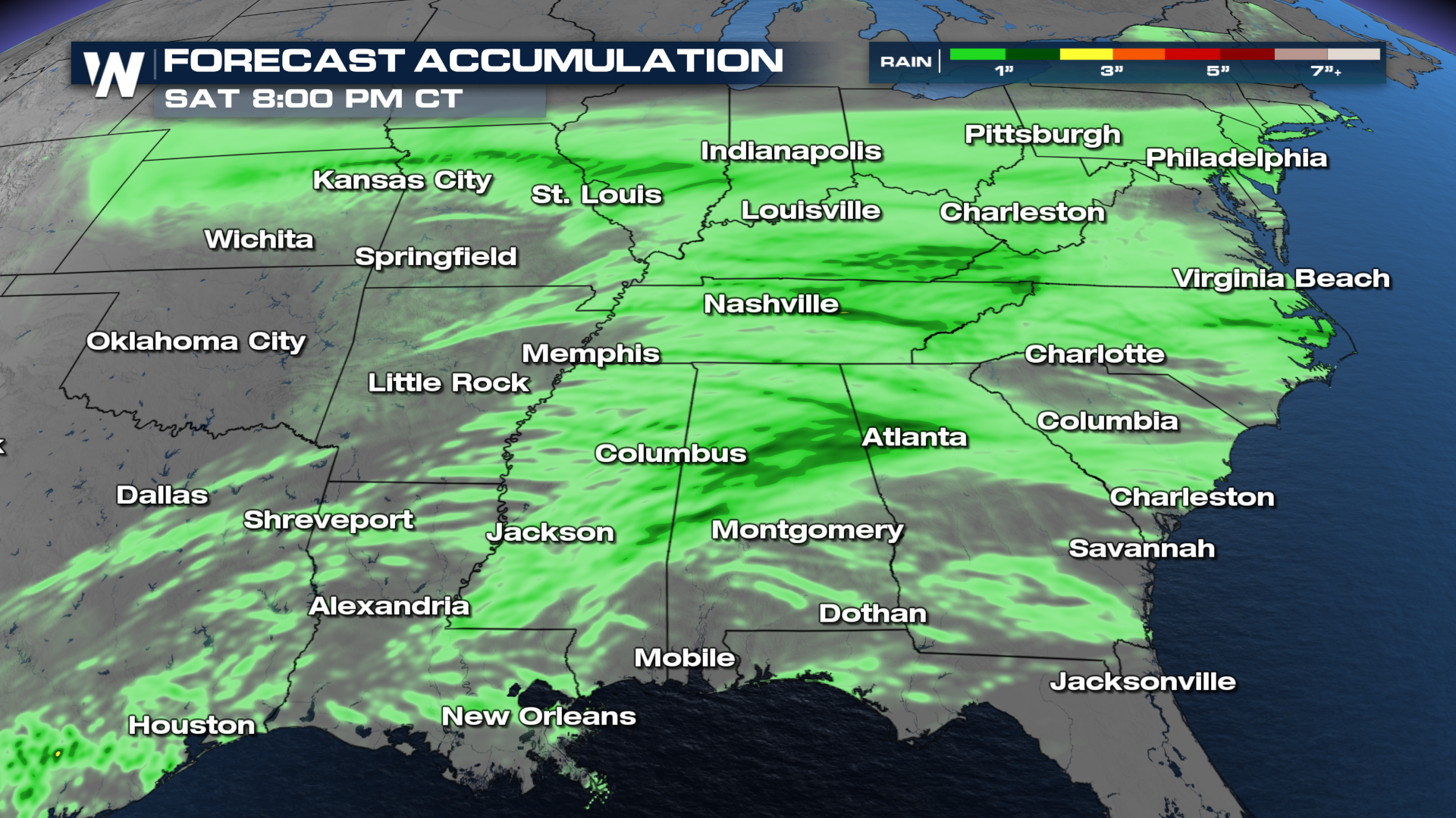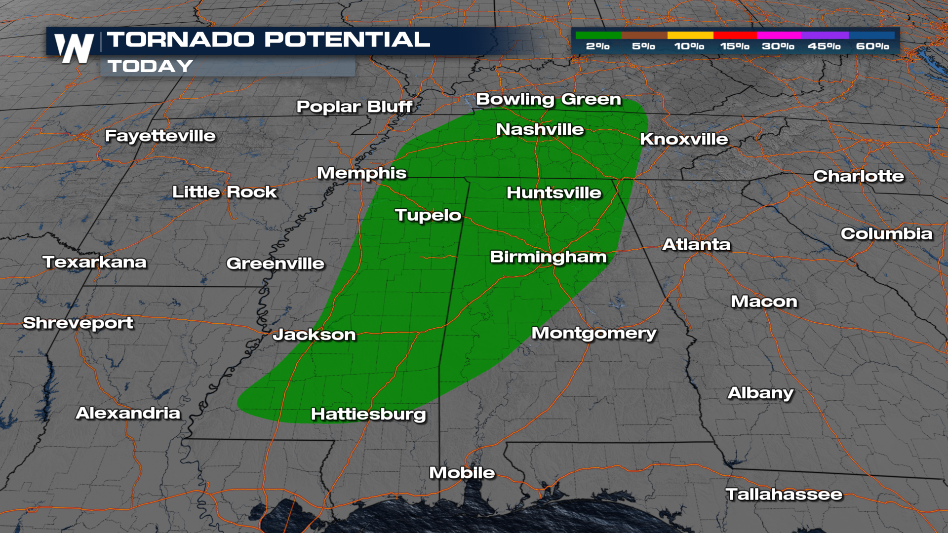 Scattered heavy downpours are expected to persist north of the low across the Midwest through the morning, with the rain shifting east and breaking up some through the afternoon. Severe storms could form in the mid-afternoon, but the primary threat is likely to occur from the evening into the overnight hours. Our high-resolution forecast model shows supercell thunderstorms developing late in the evening in West Tennessee, before tracking east overnight into the Deep South.