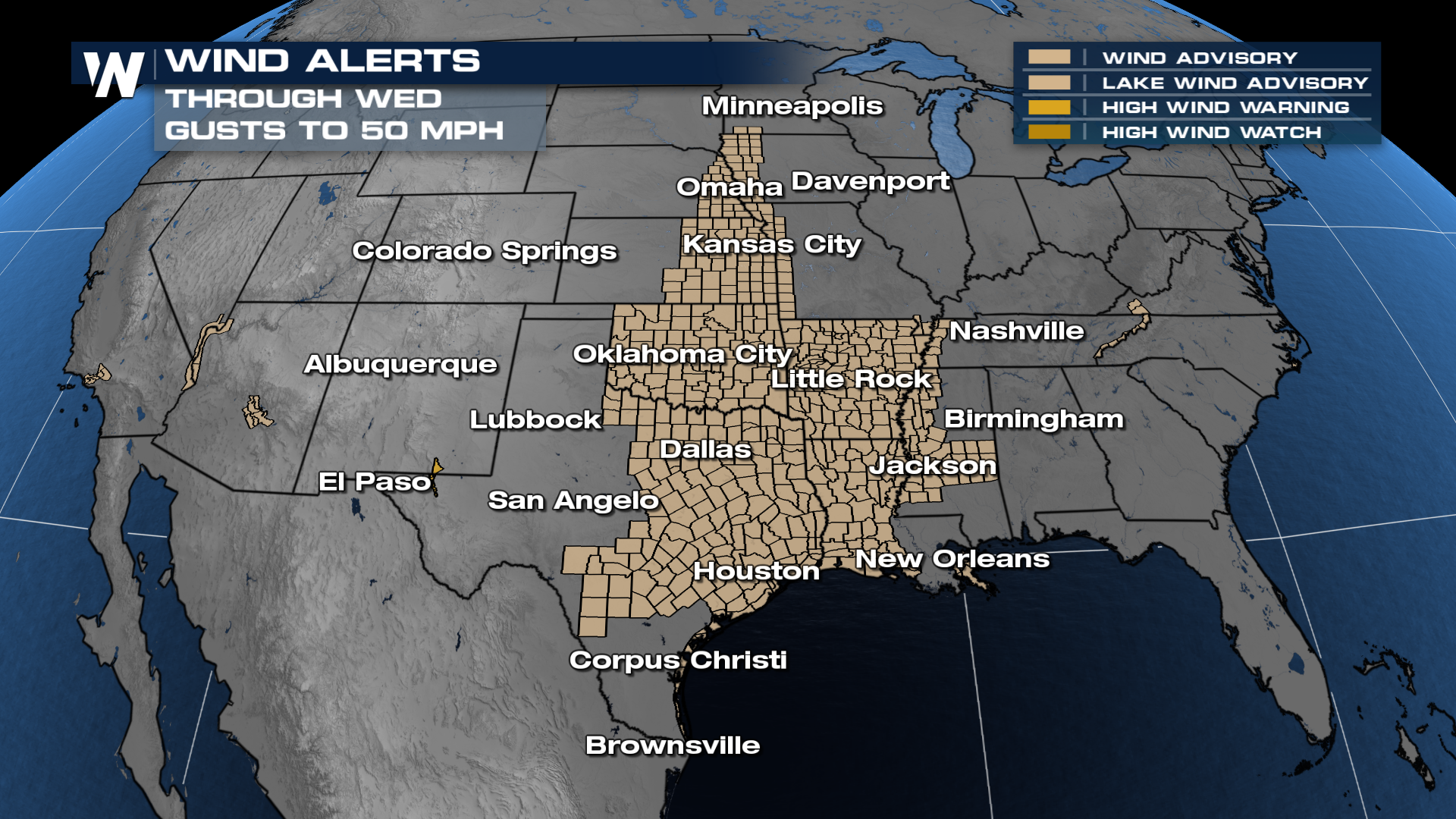 Wind alerts have been issued through Wednesday across the central U.S. Gusts up to 50 mph.