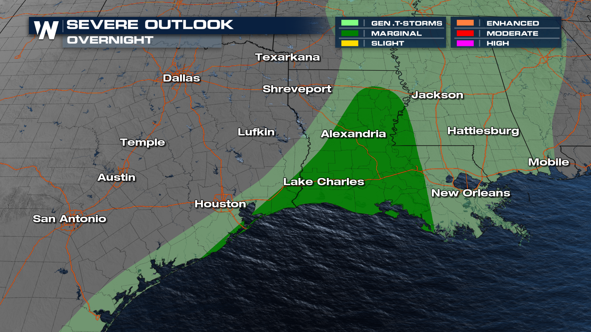The Storm Prediction Center has dropped to a MARGINAL (level 1 out of 5) risk for severe weather across portions of east Texas and Louisiana through Wednesday morning.