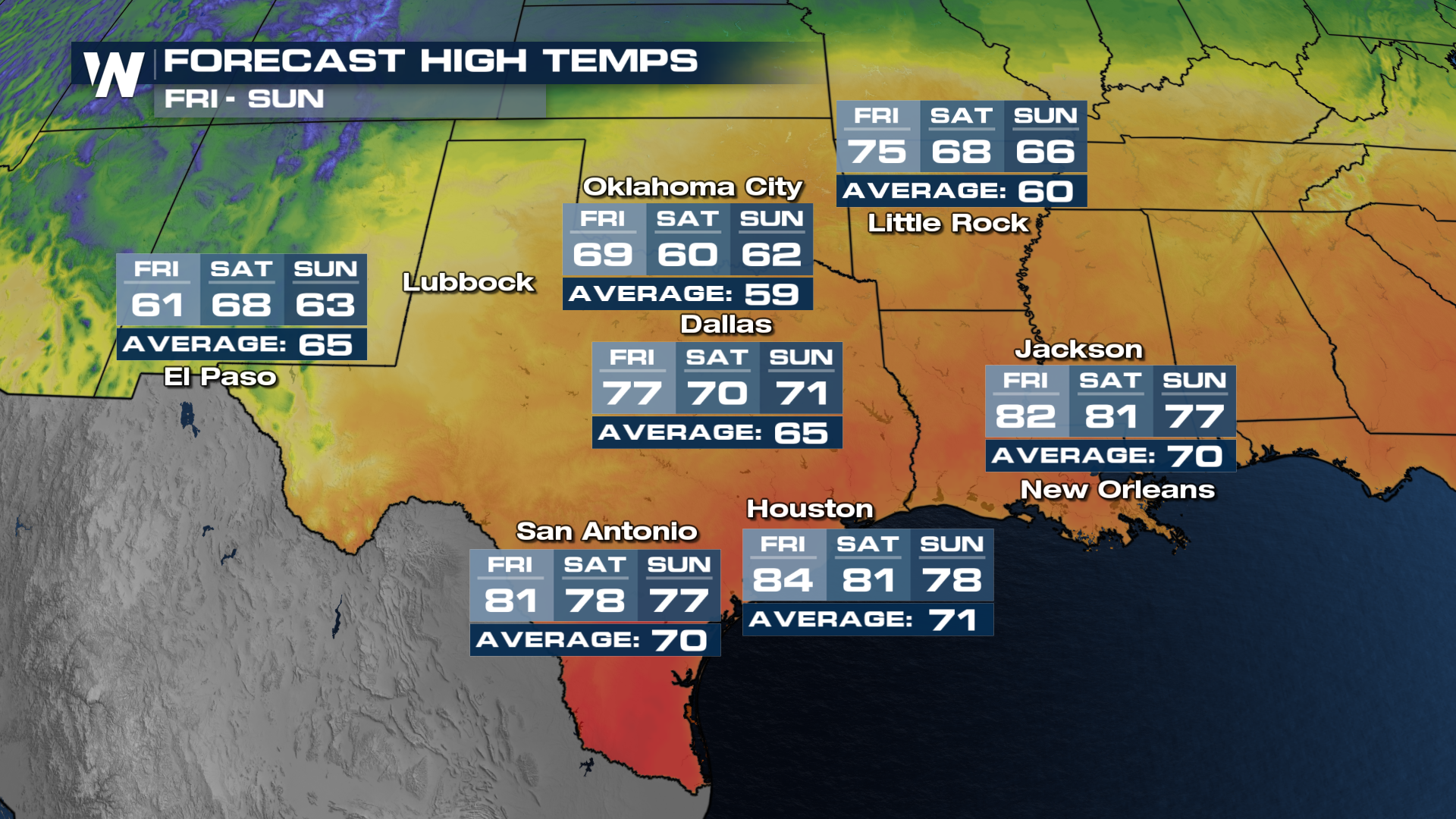 As a cold front sweeps through, it'll bring temperatures back to seasonal norms for the weekend. However, the front will not push down into the Gulf, allowing these areas to remain much warmer than average into next week.