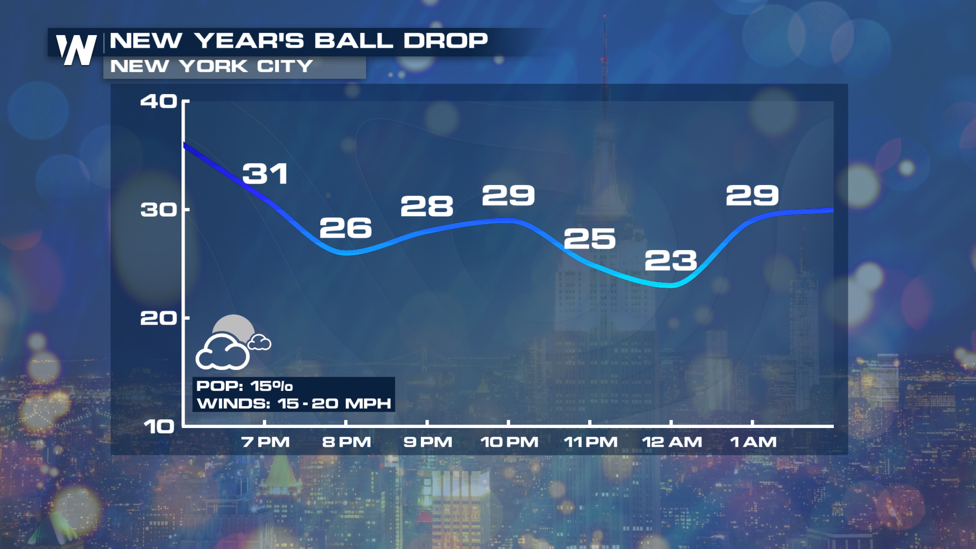 As we say goodbye to 2025 and ring in 2026, many parts of the country can expect active weather for this year’s ball drop. In New York City, home to the nation’s largest New Year’s Eve celebration, conditions will turn cool through the evening and overnight, with a low chance for a few light snowflakes around midnight. Temperatures are expected to fall below freezing, dropping into the 20s.