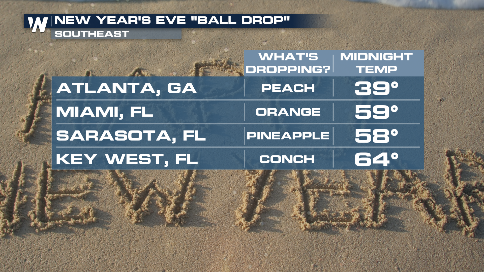 In the Southeast, a giant peach drops in Atlanta, where temperatures at midnight will be in the 30s. Meanwhile, a giant conch shell drops in Key West, with much warmer temperatures in the 60s.