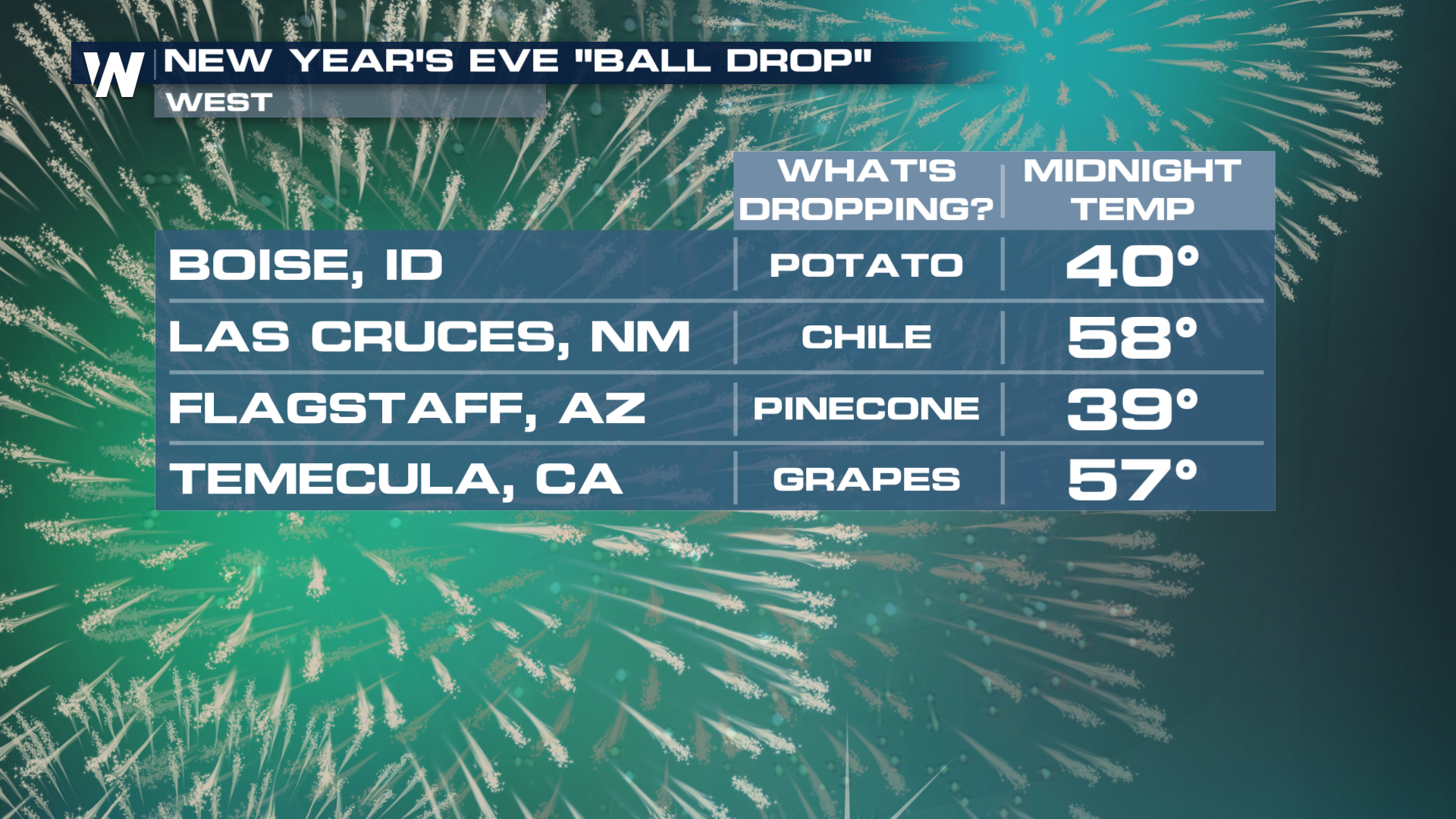 Out west, some locations will stay relatively mild. In Boise, Idaho, spectators can enjoy the famous potato drop with temperatures around 40 degrees at midnight.