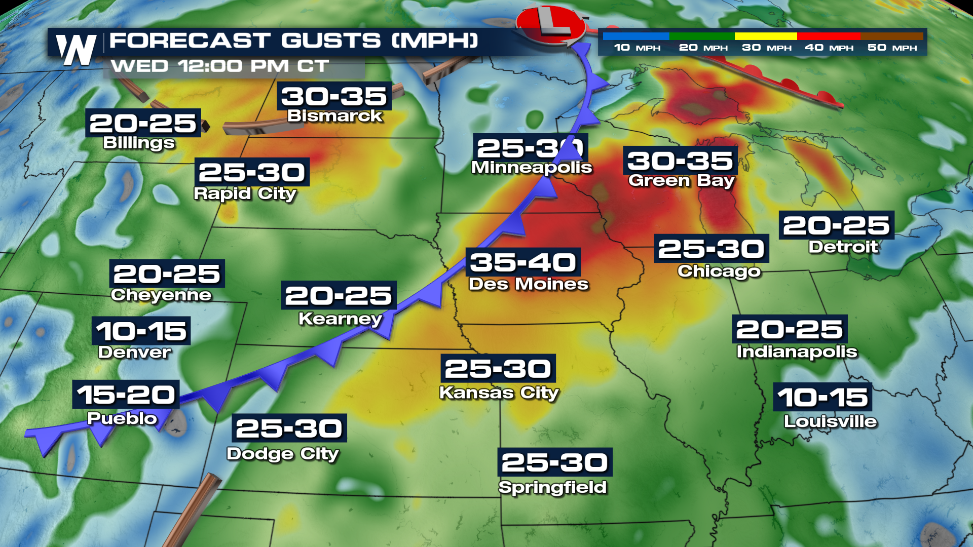 A lot of wind energy with this trough of low pressure, which will be the biggest impact out of the next few days. Wind alerts cover quite a bit of real estate in Montana, where winds could gust as high as 90 mph in the highest elevations! Wednesday looks like the windiest day in the Upper Midwest.