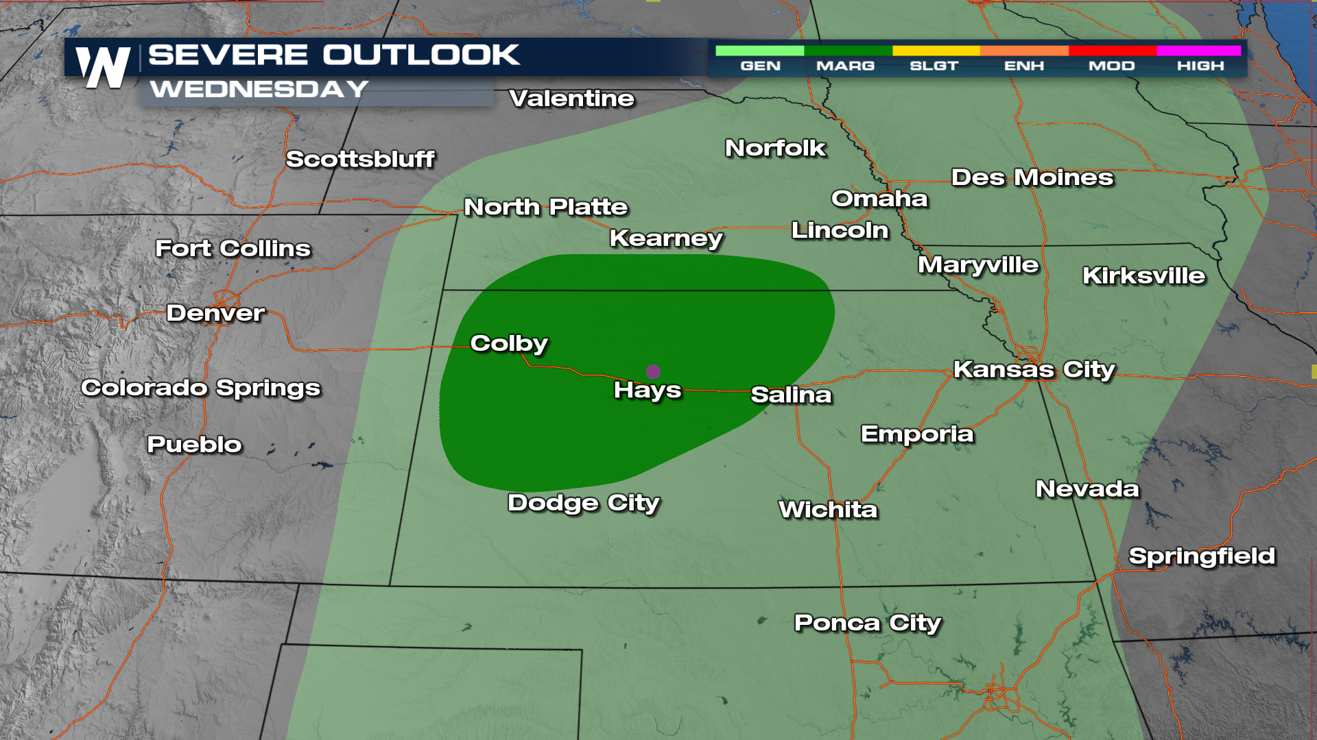 SEVEREThat front will be the focus of what could be a few severe chances. Right now, Wednesday looks like the best bet, with slightly better thunderstorm coverage. Storms look to fire around the front and move into slightly colder temperatures north of it. The biggest concern right now will be large hail. The Storm Prediction Center is circling portions of Kansas and Nebraska with the highest threat.