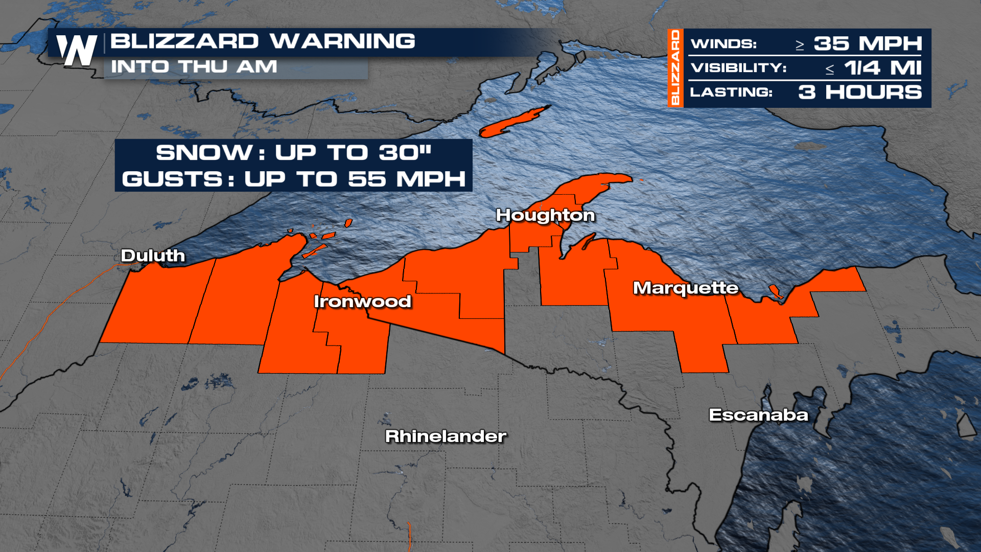 Blizzard Warnings remain in place for portions of Wisconsin and Michigan. When visibility is reduced to 1/4 or less, winds are greater than 35 mph, and this lasts for 3 hours, this classifies a winter storm as a blizzard.