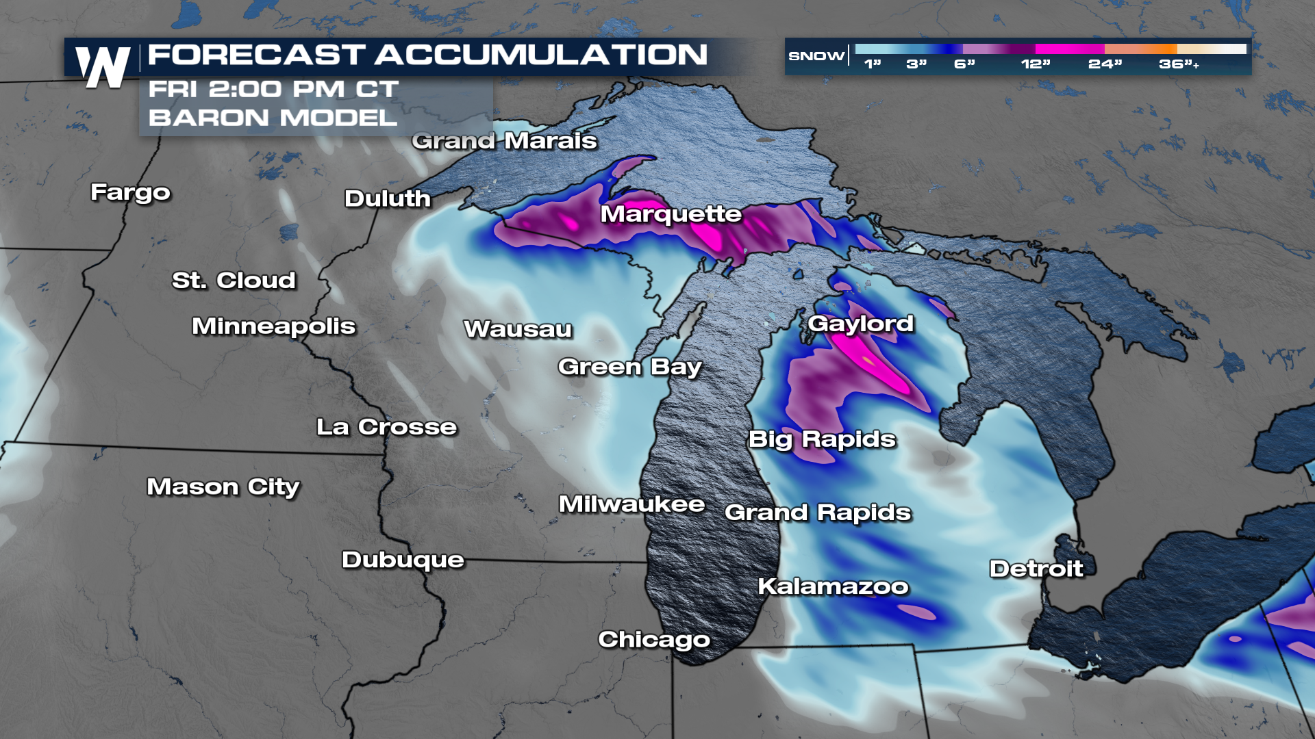 Northern Wisconsin and the Upper Peninsula of Michigan could accumulate up to one to two FEET of snowfall due to the nature of lake effect snow.